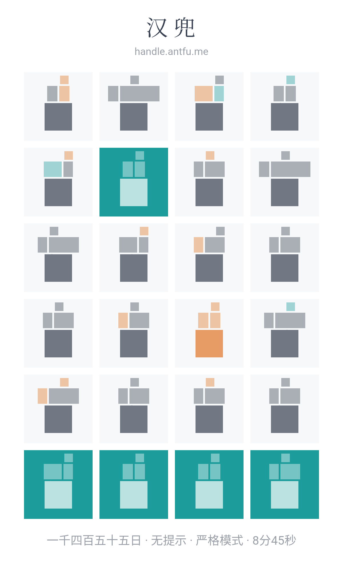 汉兜(https://handle.antfu.me/)是一个通过声母、韵母和声调猜成语的游戏。