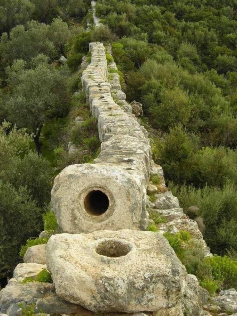 Portion of a Roman Aqueduct made out of hand-carved marble. The pieces fit together tightly enough to be airtight, and act as an "inverted syphon", carrying water down one side of a valley and up the other.