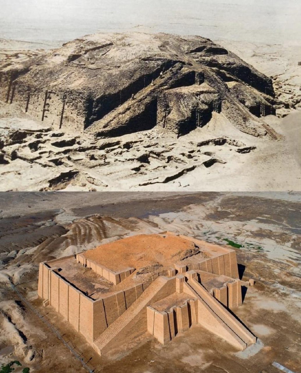 Before and after the excavation and restoration of the Great Ziggurat of Ur.