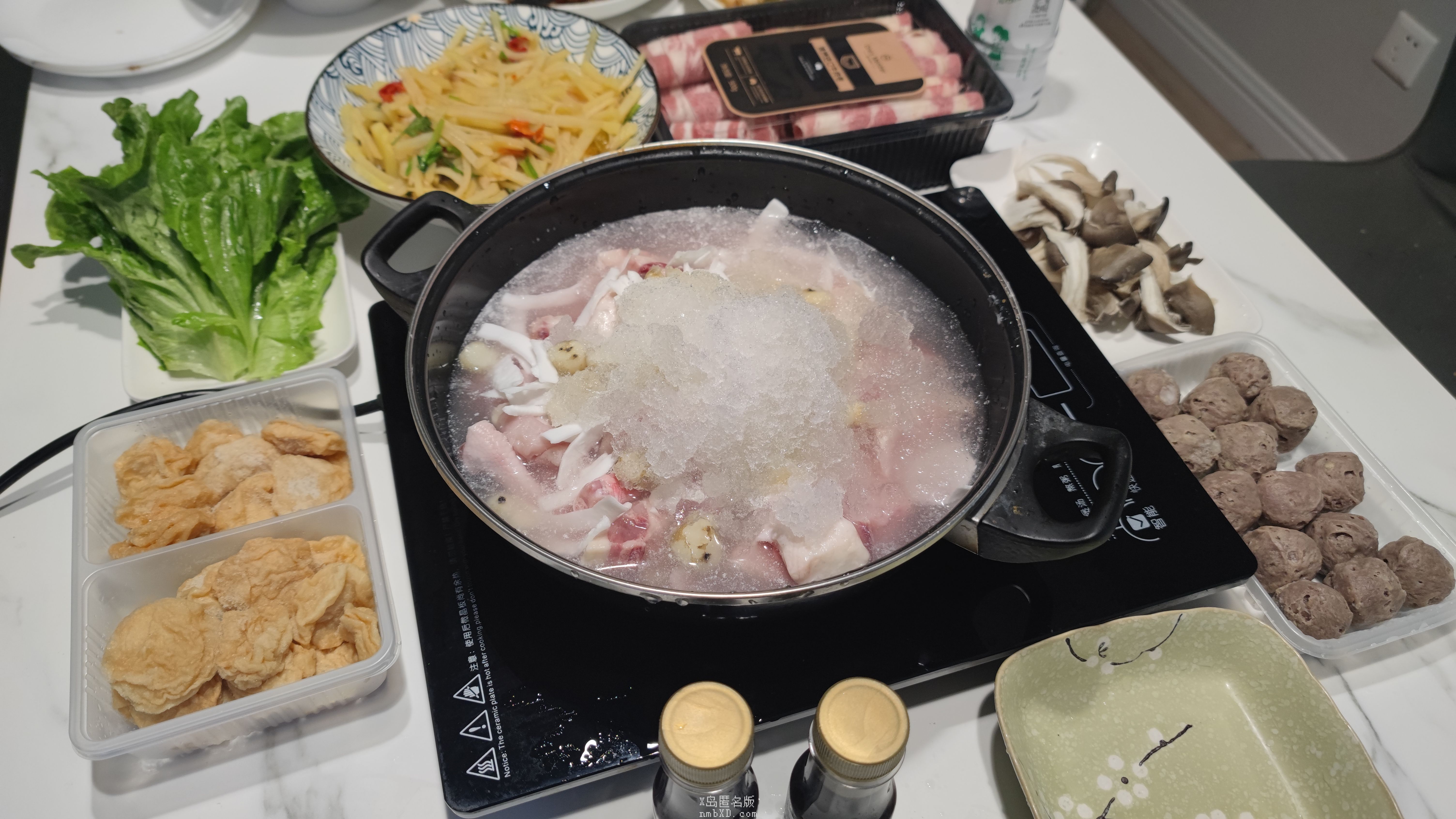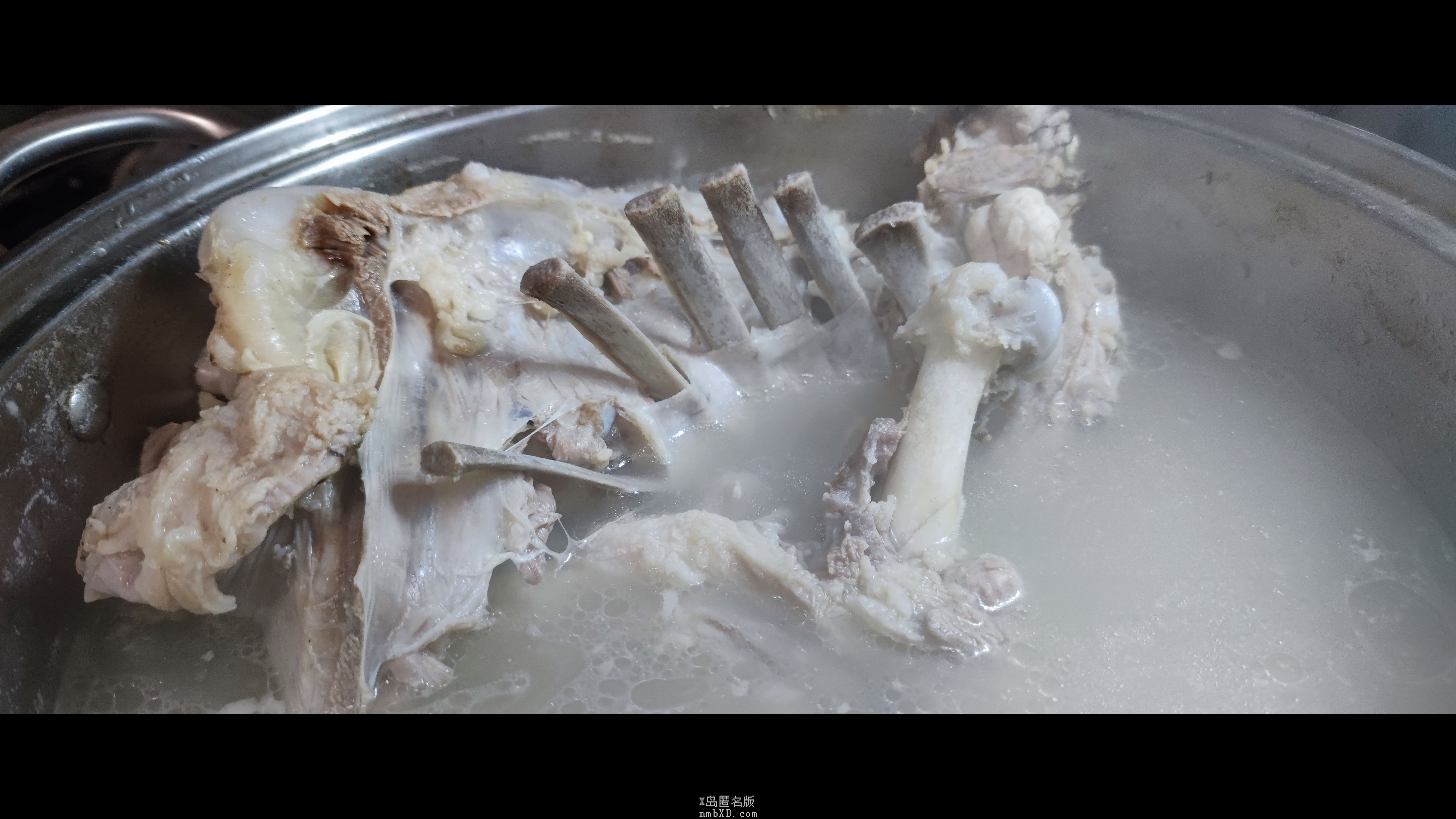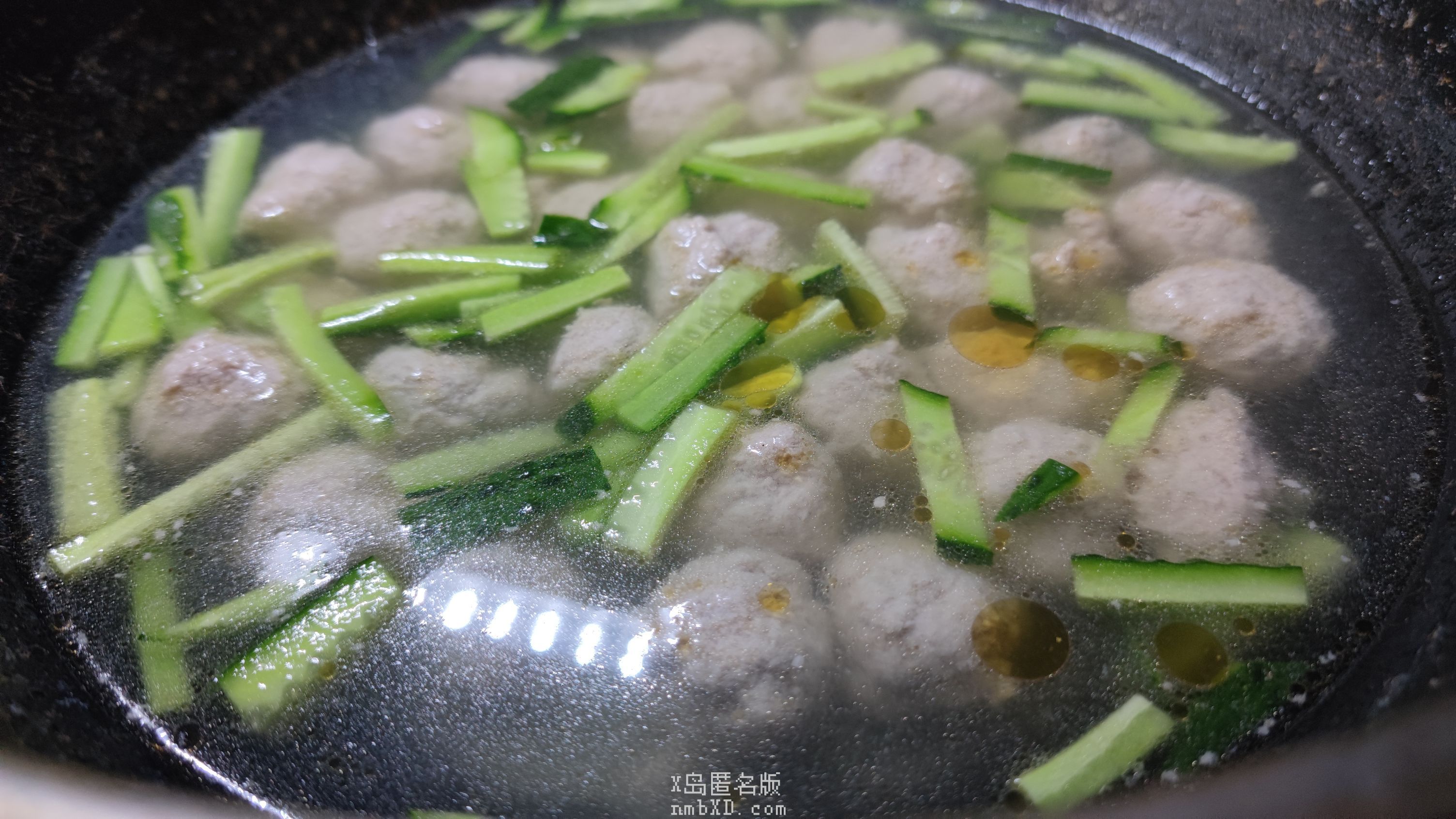 待鸡肉见底,放入肉丸,盖盖静待。不出片刻,肉丸膨大三分,漂浮在半透明的水面上,这是成熟的标志。