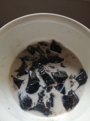 是凉粉粉加糖做的黑凉粉,奶粉喝完了,所以下的椰子粉。昨天做的,直接放冰箱凝固,好吃,但是也好冰( ;´д`)。