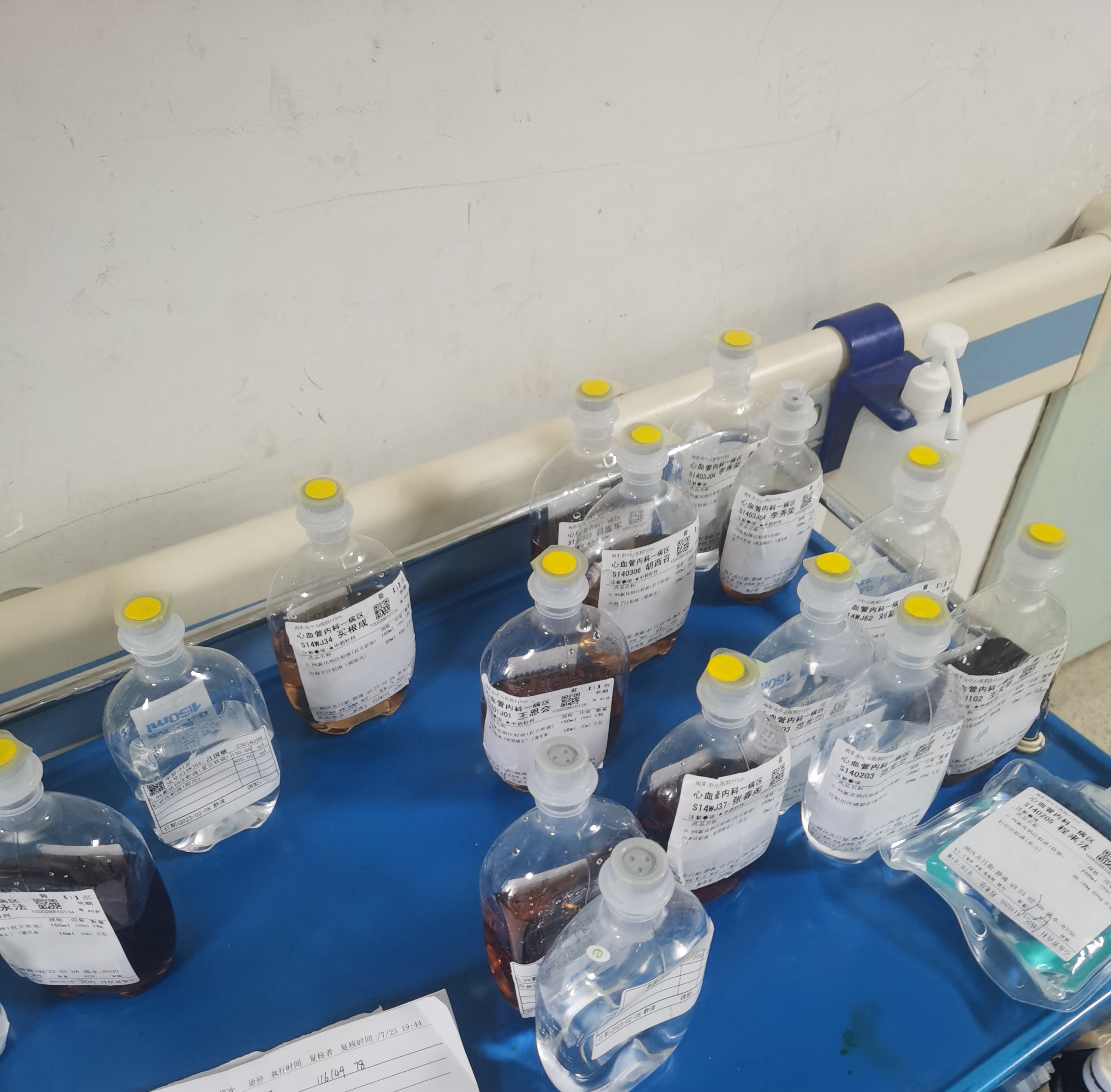 年轻的小护士正在巡视他的领地,忙碌了两三个小时的小护士,终于只剩下这么多水了。