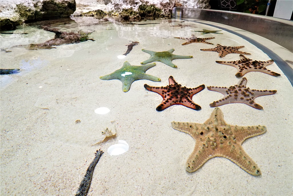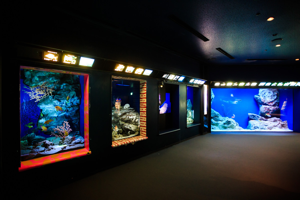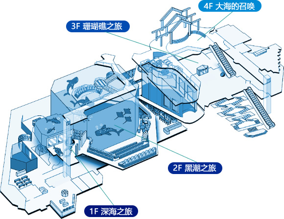 那是位于三层的,名为“珊瑚之海”与“热带鱼之海”的水槽。这两个水槽没有屋顶,阳光可以自然地照亮它们,因此位于四层的你们才能提前一步看见其中的景色。