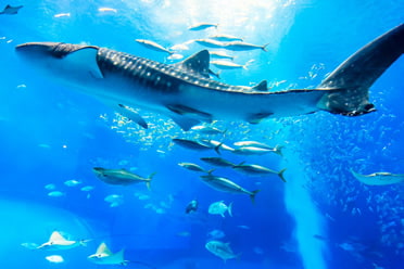 “快看快看,好多鱼哦!”你攀着栏杆,指着楼下碧蓝色的水面。明亮的阳光照进了清澈的水池中,池中的珊瑚仿佛是盛开的花朵,绽放出了色彩斑斓的光芒。五颜六色的热带鱼在珊瑚丛中自在地穿行,如同是一群轻盈的舞者。