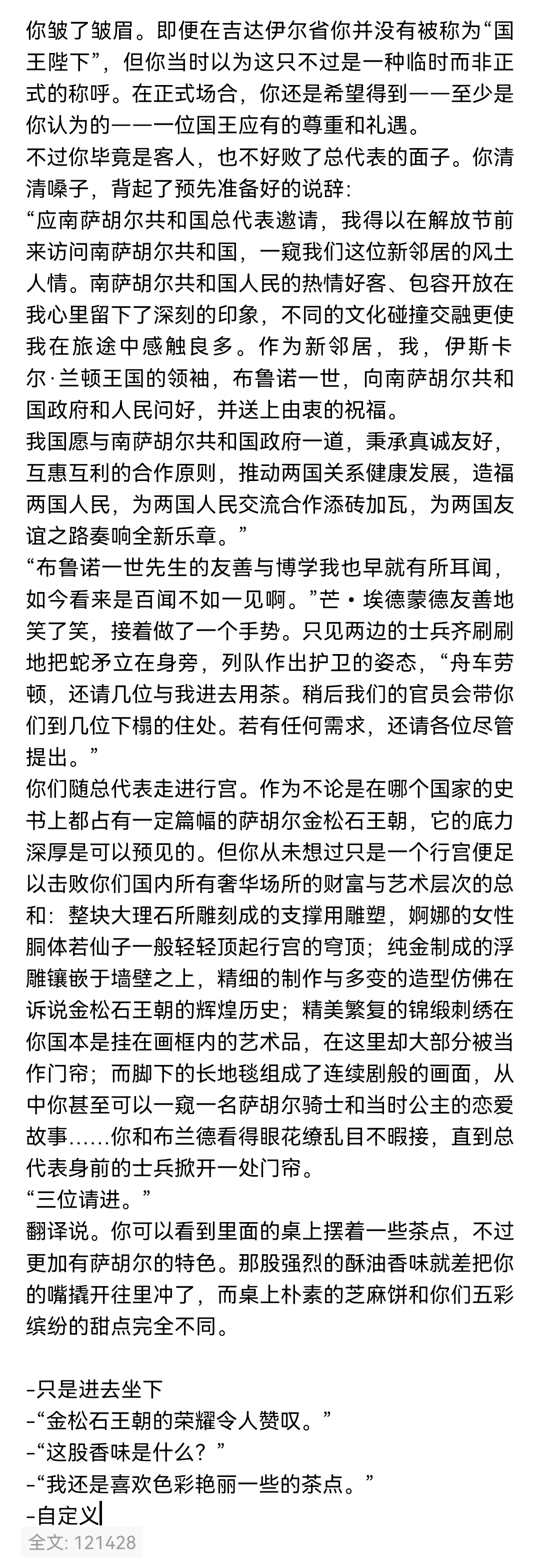 总代表和他的主厨在露水台的门口依次接待各位领导人,周围则是重兵把守。在一番外交寒暄过后你们很快进去入座,多莉安娜以翻译的身份坐在你右侧,而布兰德佩剑在你左侧侍立。