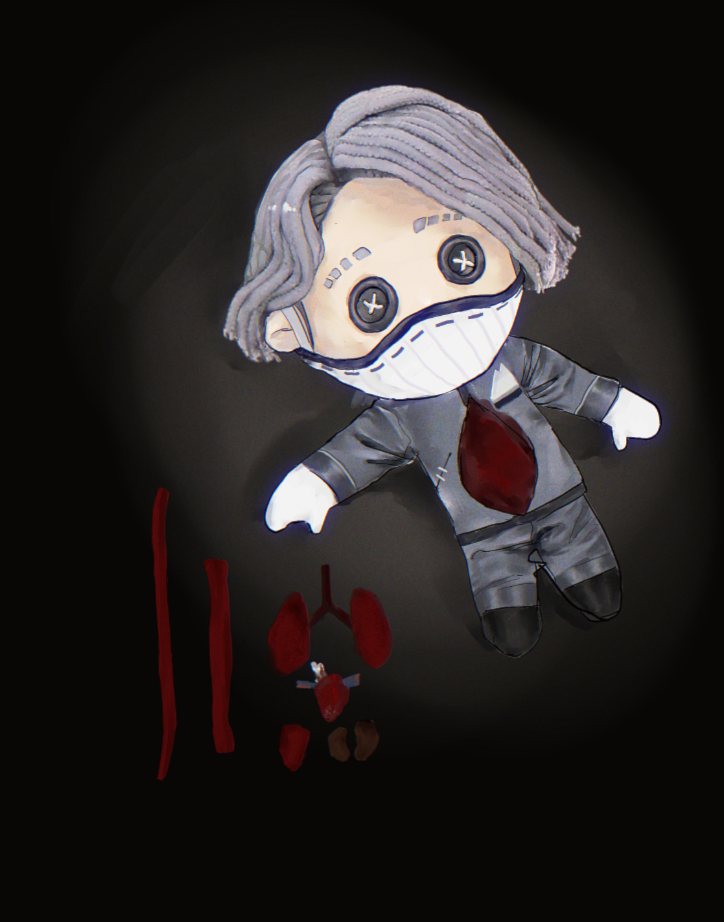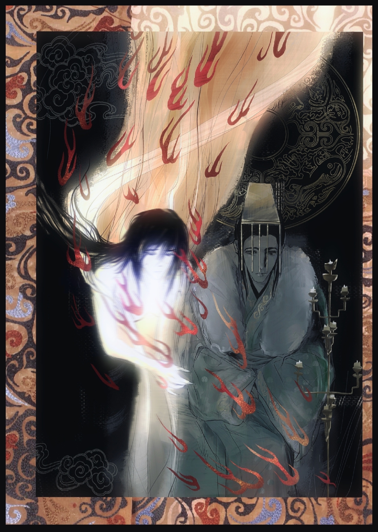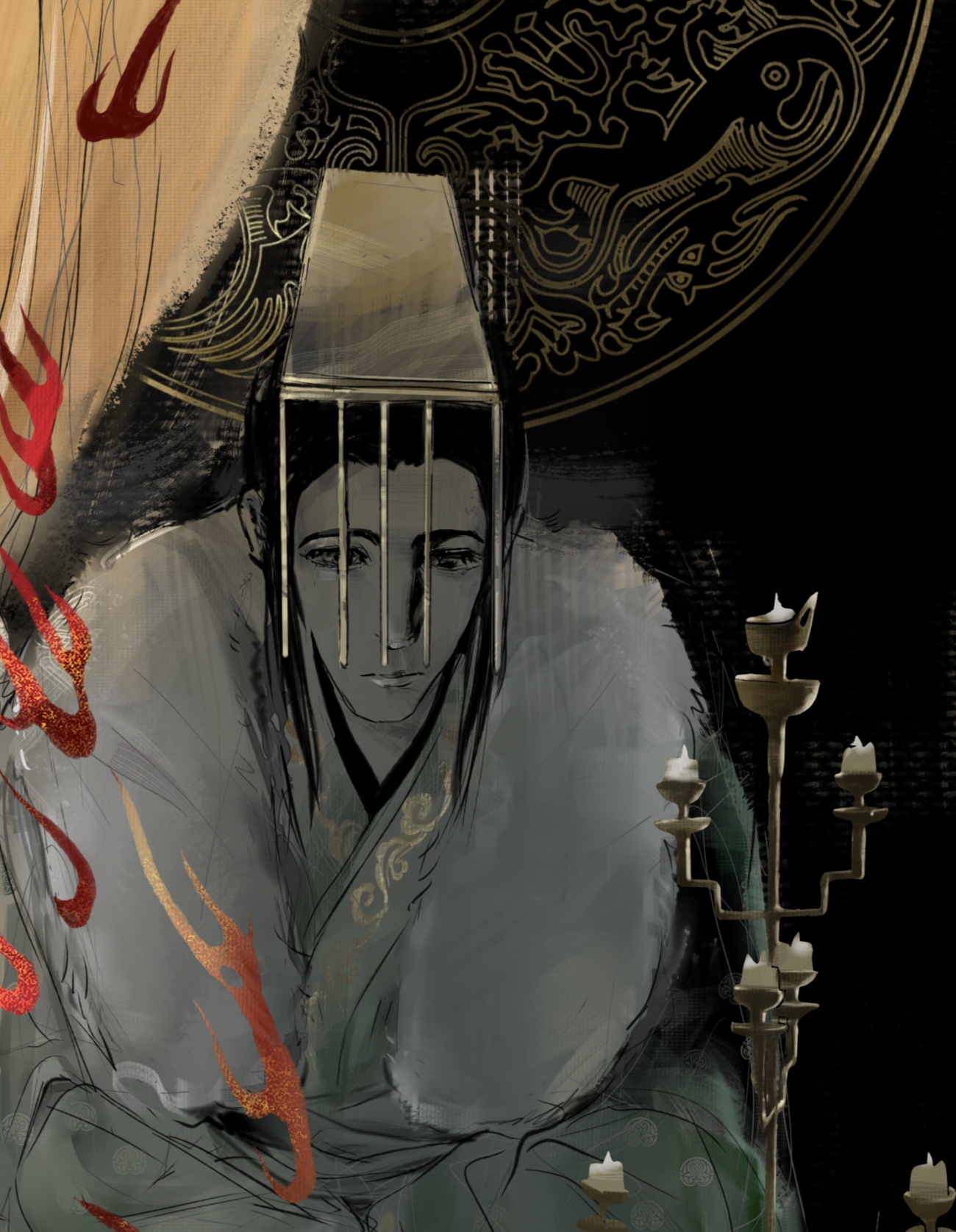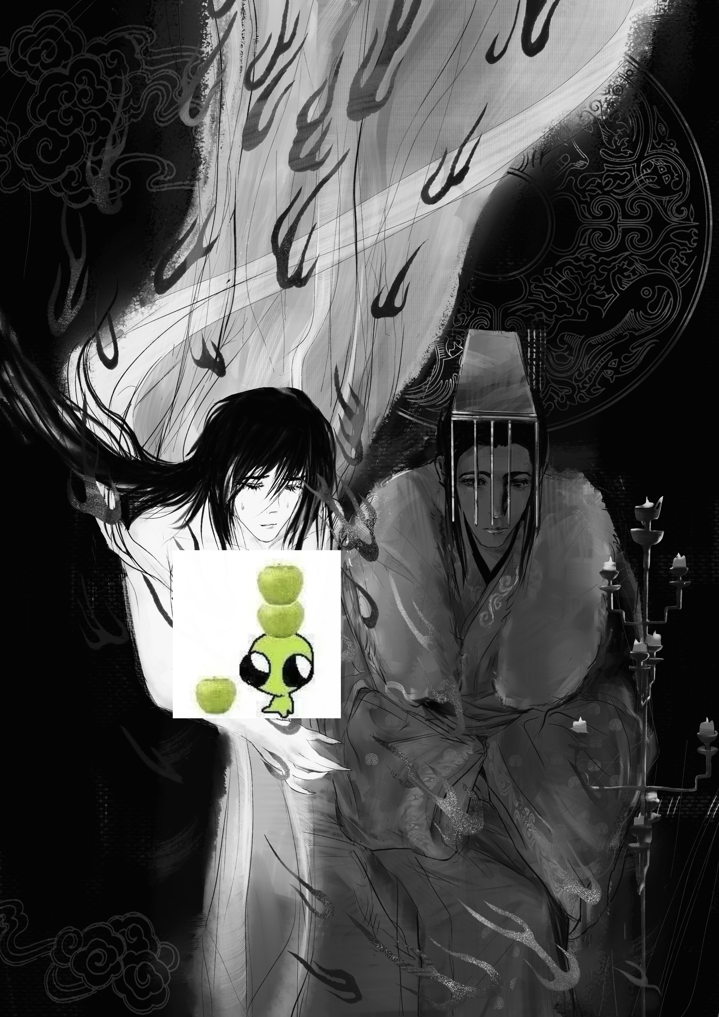 右边的角色本来是想表现油尽灯枯这样的意境,整体是深色暗淡的所以没有给光源,我也试着把烛台移到左侧,但是这样又显的右侧单调了……(´゚Д゚`)等我有时间再改改