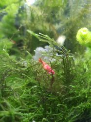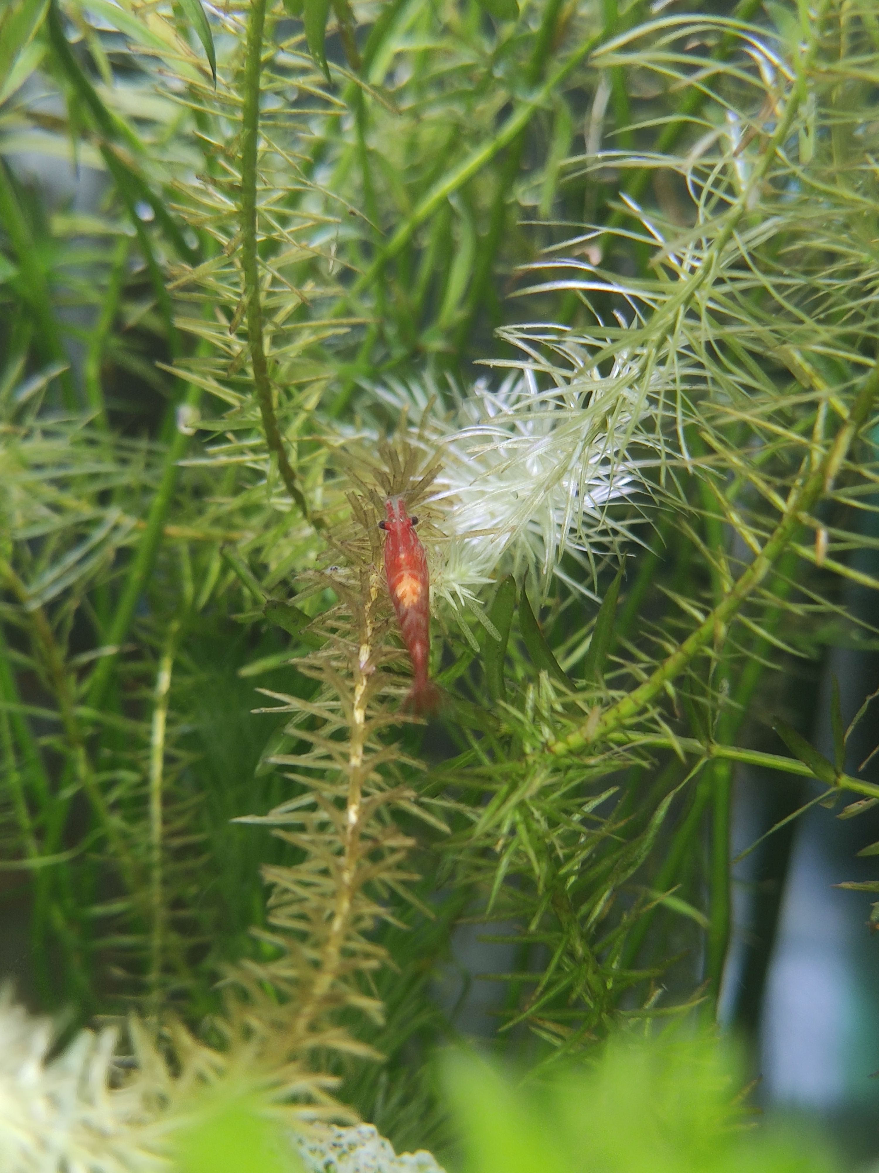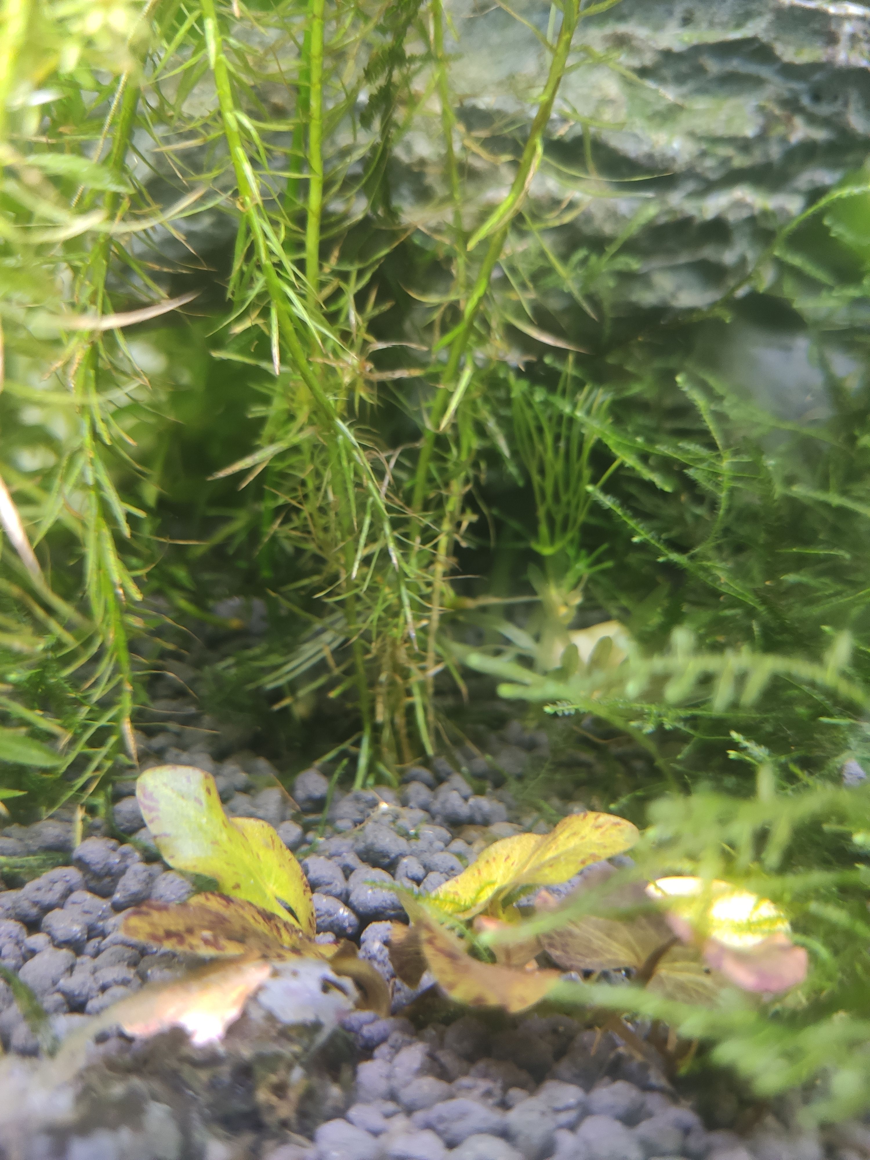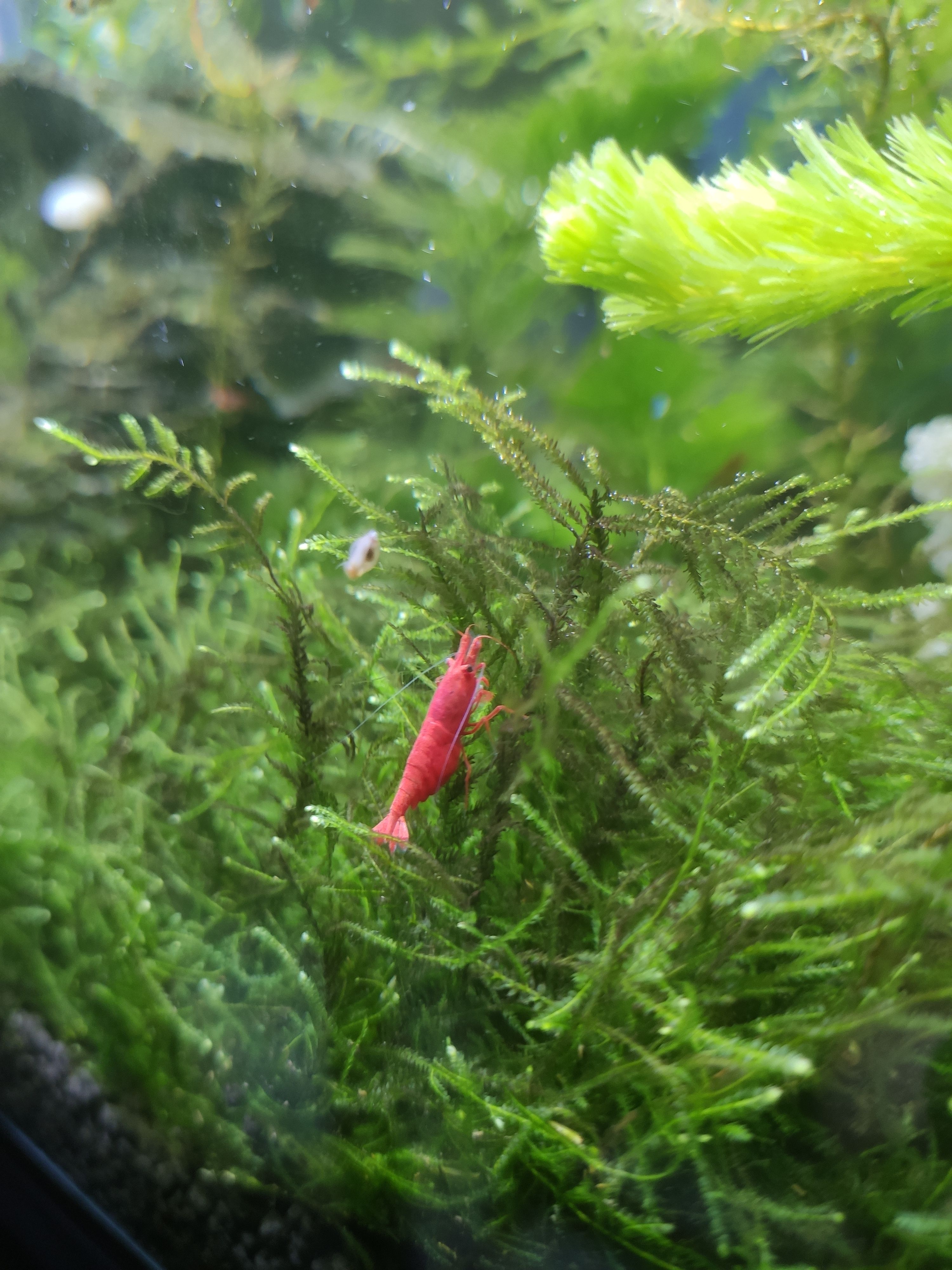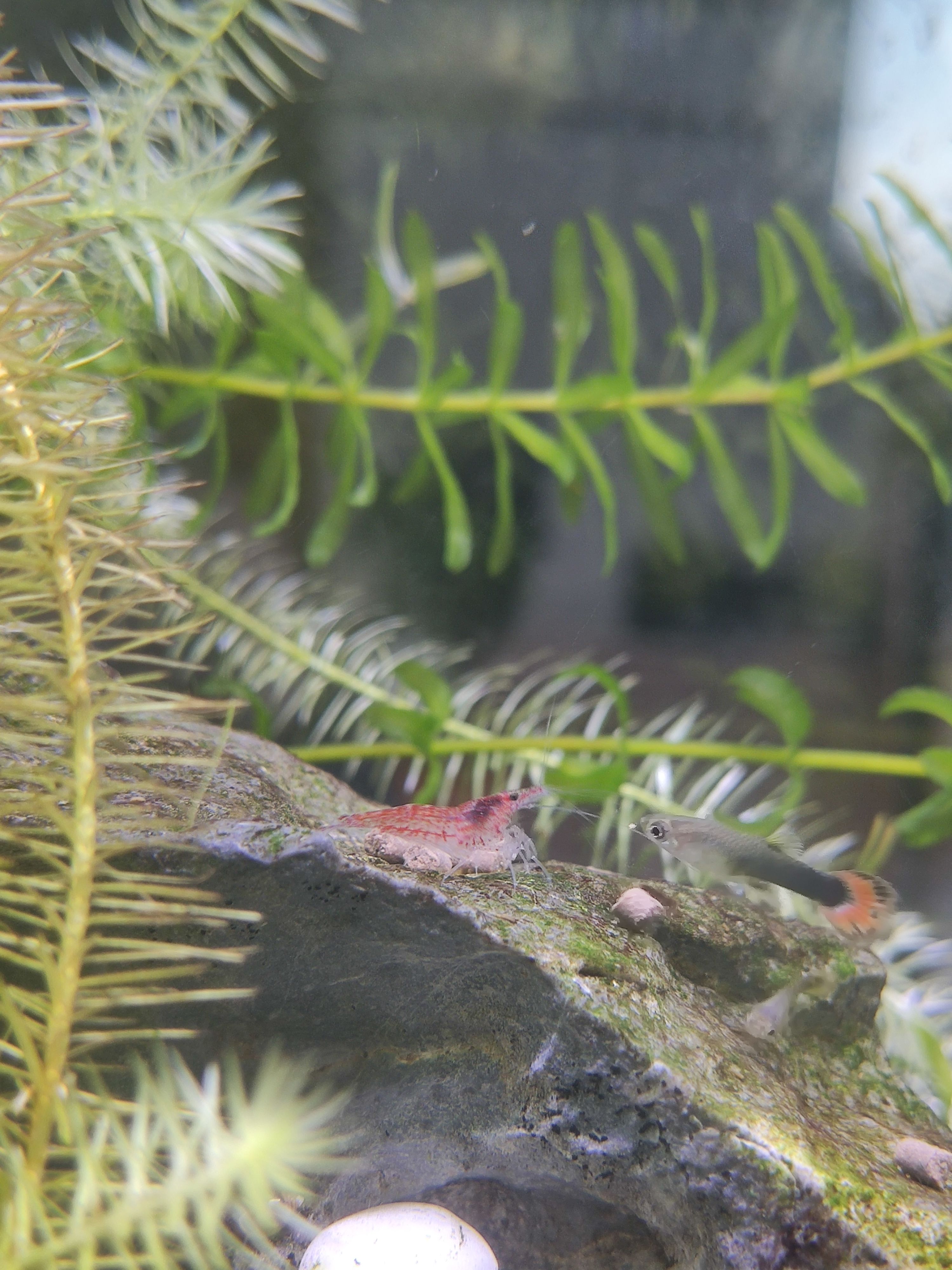 目前缸里的生物有:小孔雀鱼x7,活蹦乱跳的虾brox5,长势过于旺盛的水草,非常能生的蜗牛