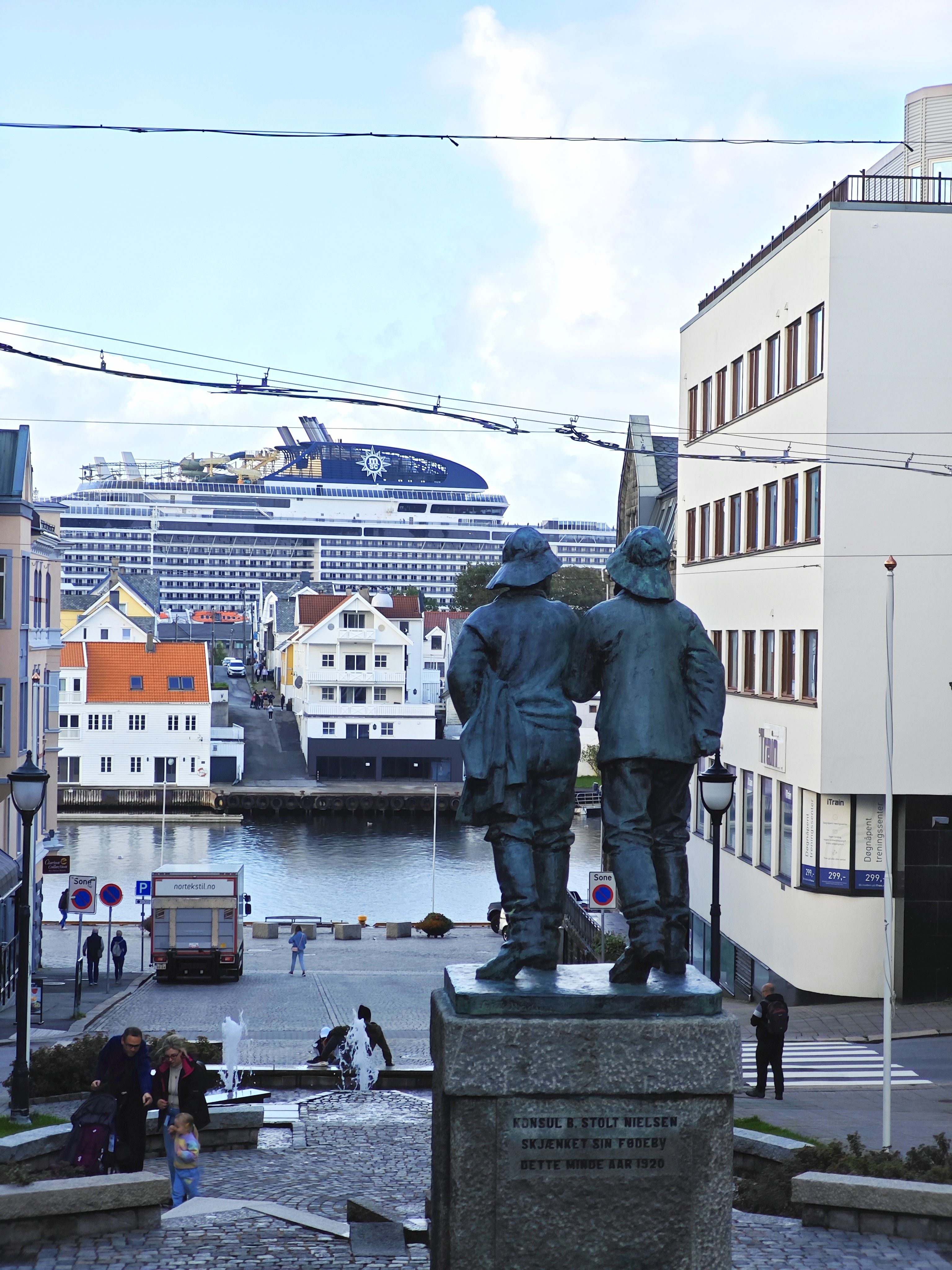 钓鱼佬铜像背后是个很好的机位,可以拍到远处的邮轮,而且不管是哪艘船,都刚好是烟囱的位置