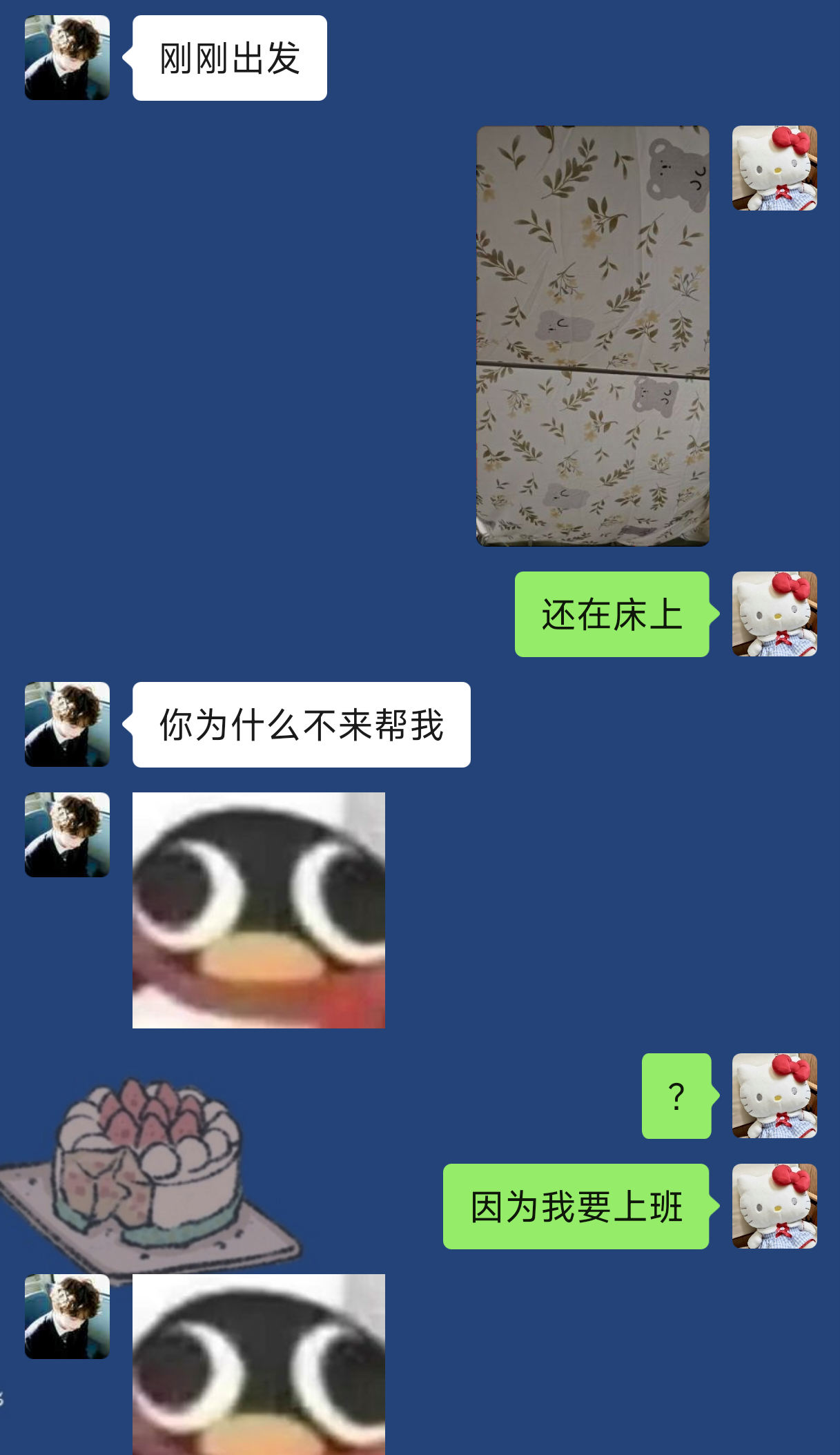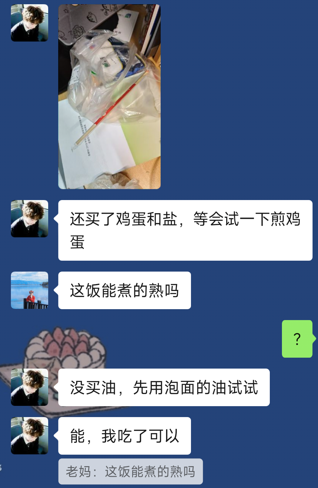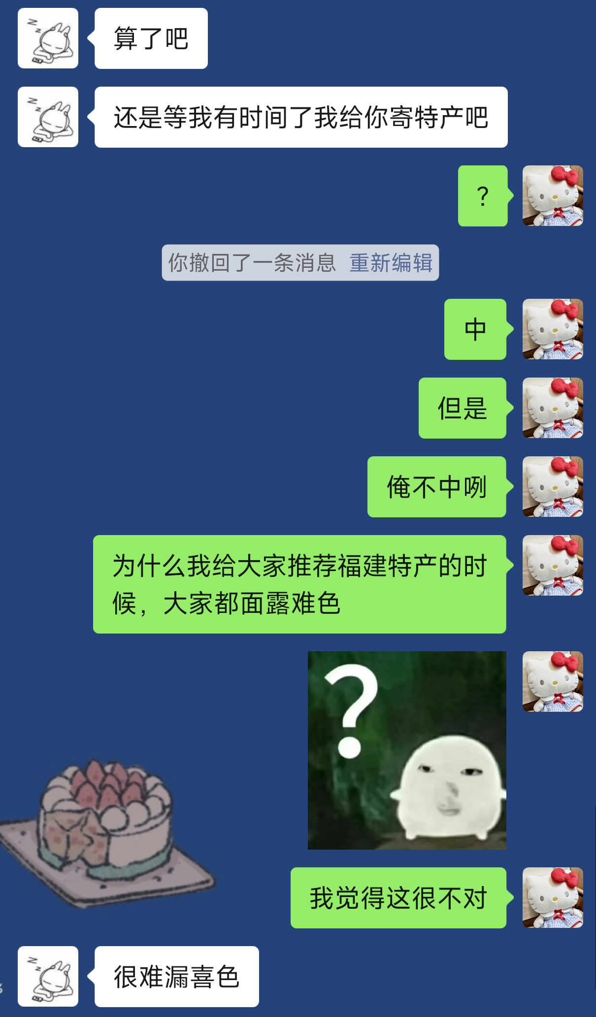 我:你吃不吃,我们这儿的鱼丸鱼面,我给你寄一点