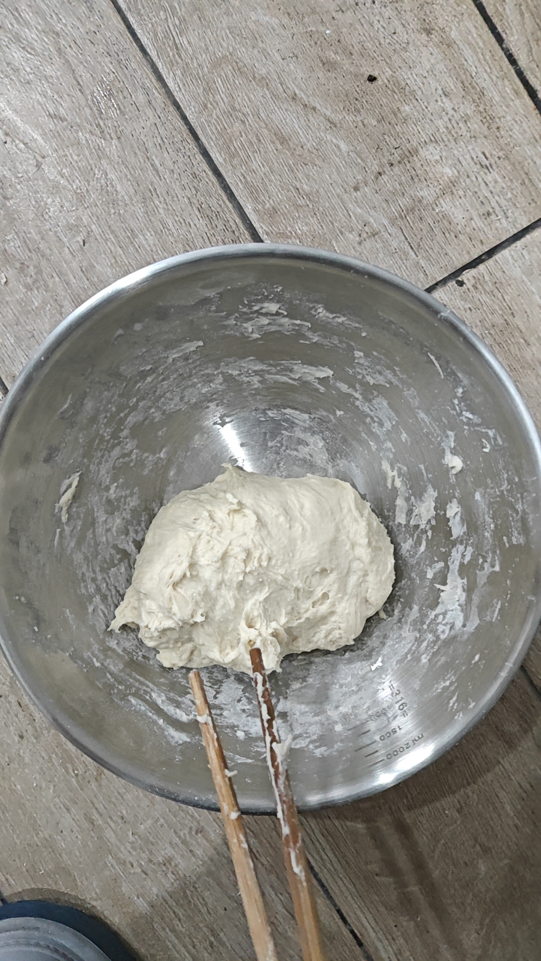 ①面粉加3g盐注入温水,边倒入边搅拌,成面团,盖保鲜膜醒面30min