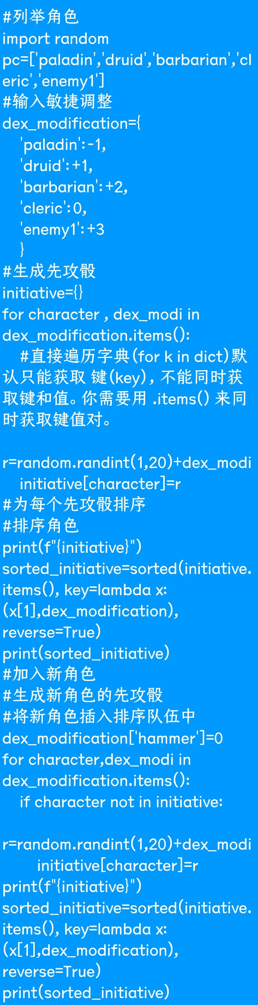 刚把先攻骰模拟写出来了,但是sorted的排序规则、随机数生成的函数和字典中.item的使用方法都是现去找d老师问的。