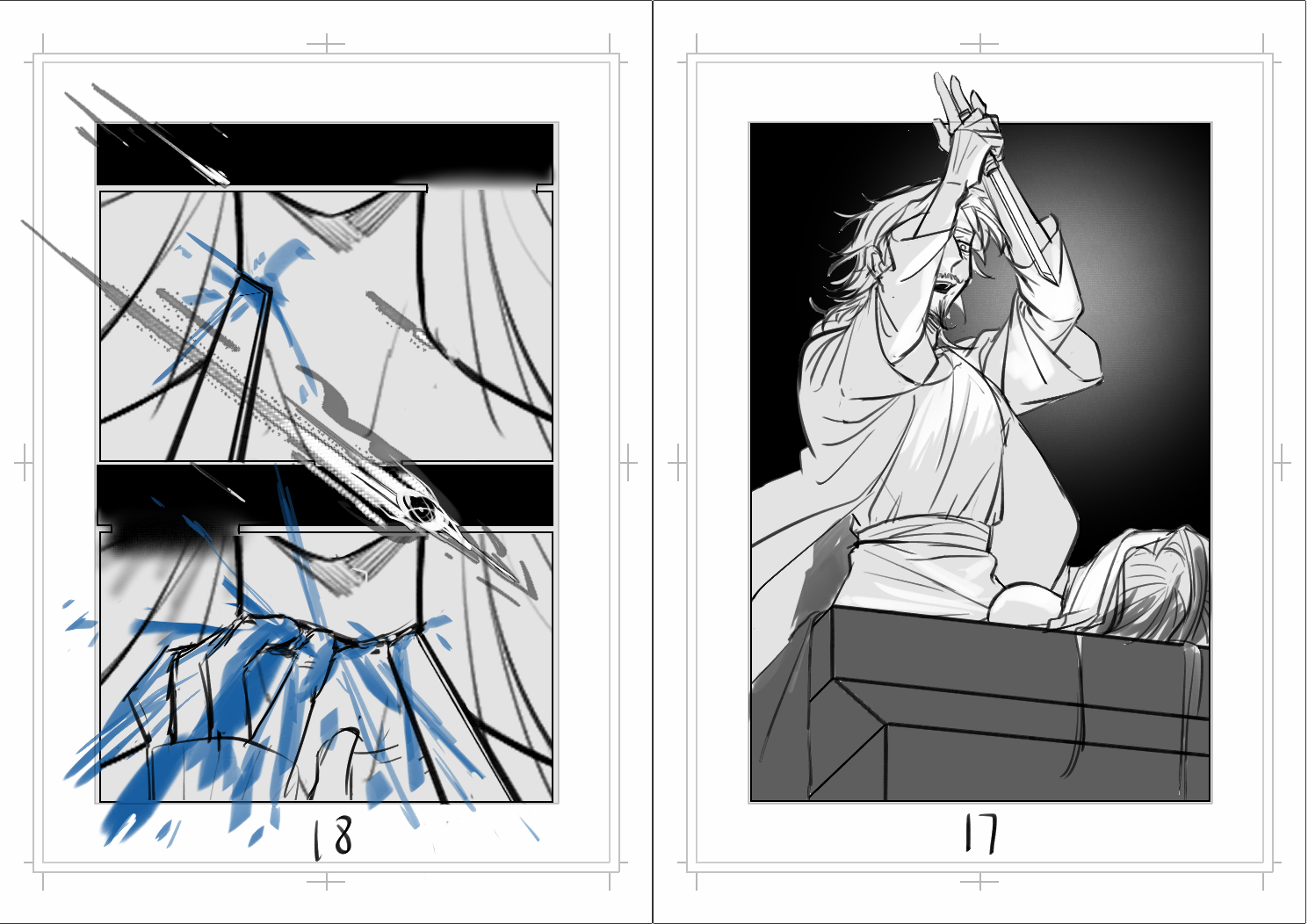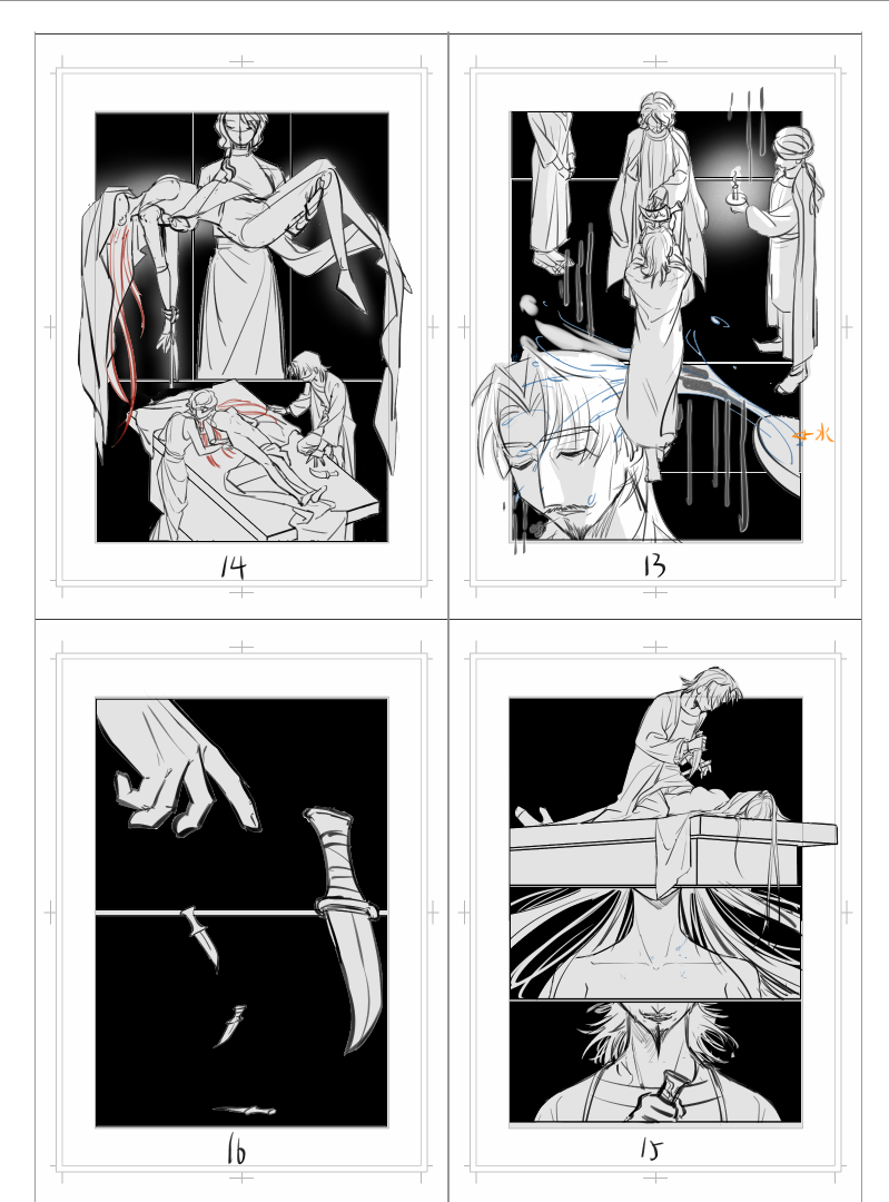 轴线怎么安排不突兀、怎么表达时间流逝、人物动作的前置条件、肢体语言、构图、情绪的积压和高潮部分的爆发、怎么做到不直接描写心理活动来塑造人物等等,需要考虑的事情跟插画完全不在一个维度,这对我来说是完全的舒适区外啊