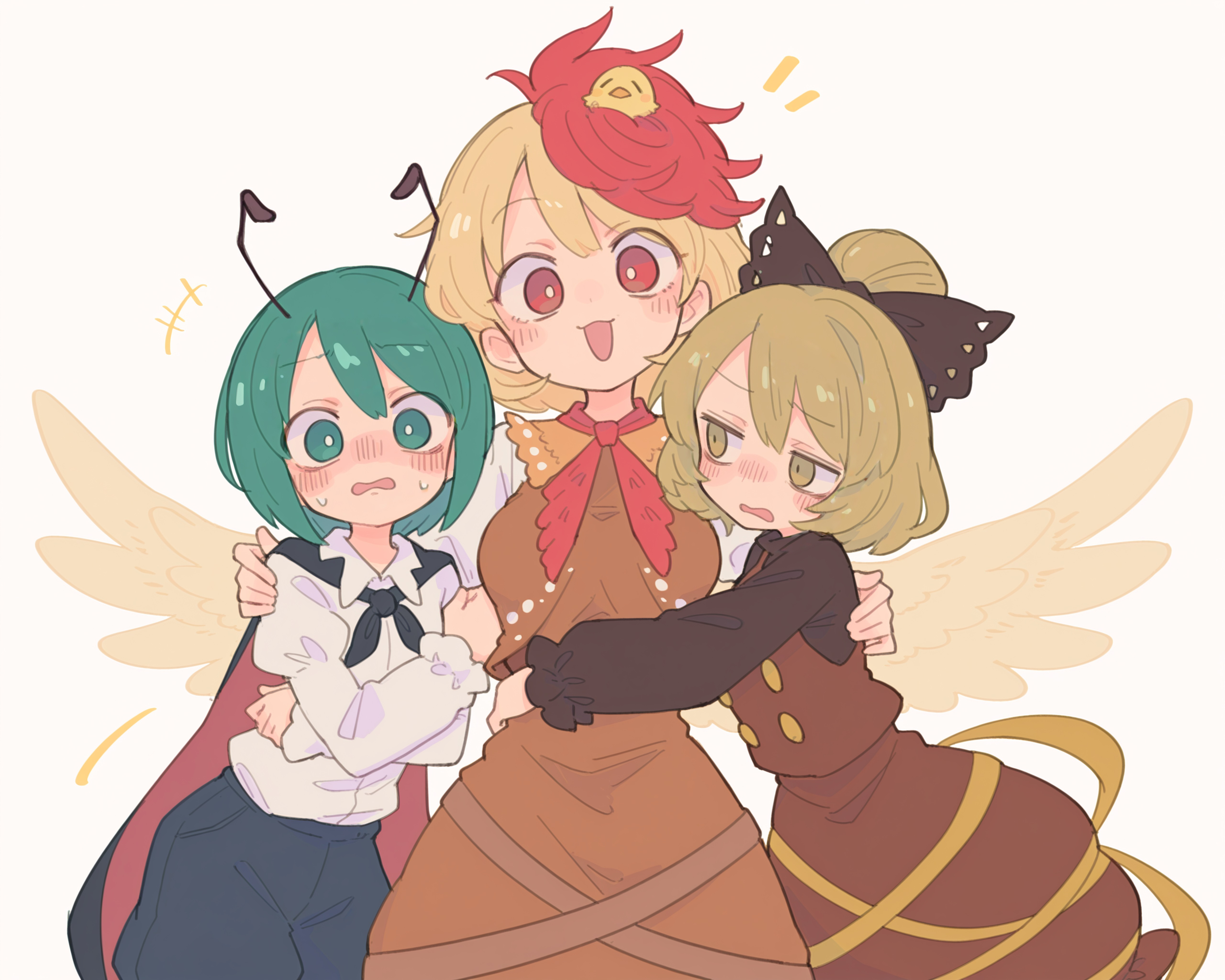 研究了下,发现用 hand on another's shoulder, (hugging both sides:1.2),能跑出来左拥右抱