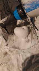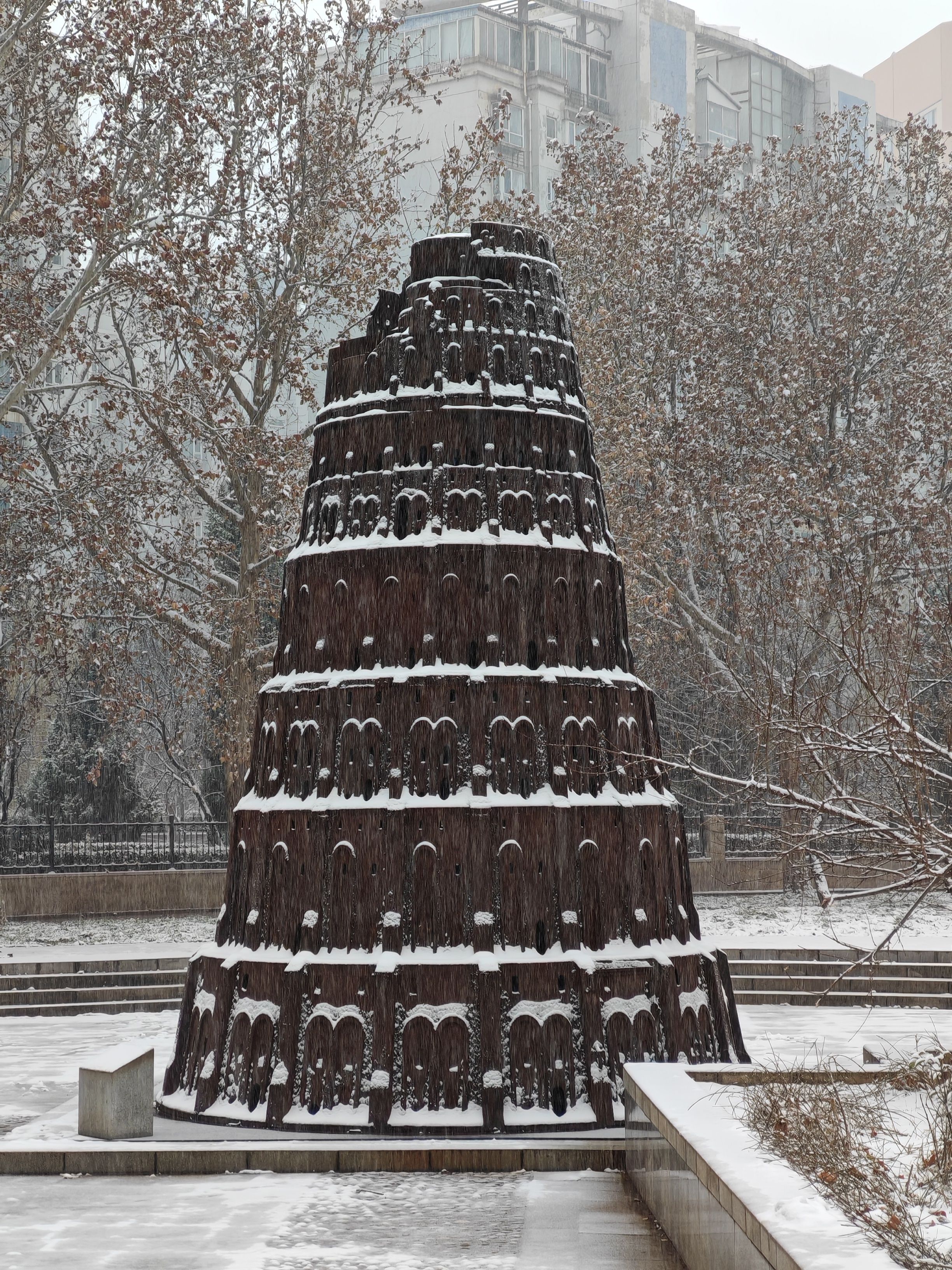 画面中,一个金属材质的圆柱形垃圾桶占据视觉中心,其圆形顶部被厚厚的白雪覆盖,雪堆正中央露出一截橙色的细棍,形似蜡烛芯,让积雪看起来如同巨型蜡烛的蜡体。垃圾桶下方有镂空的投口,金属表面泛着冷光。背景是铺着彩色地砖的地面,地砖缝隙和表面积着残雪,远处还有被雪包裹的树干底部,整体雪景营造出冬日的清冷,而雪堆上的“芯”又添了几分趣味与巧思。