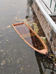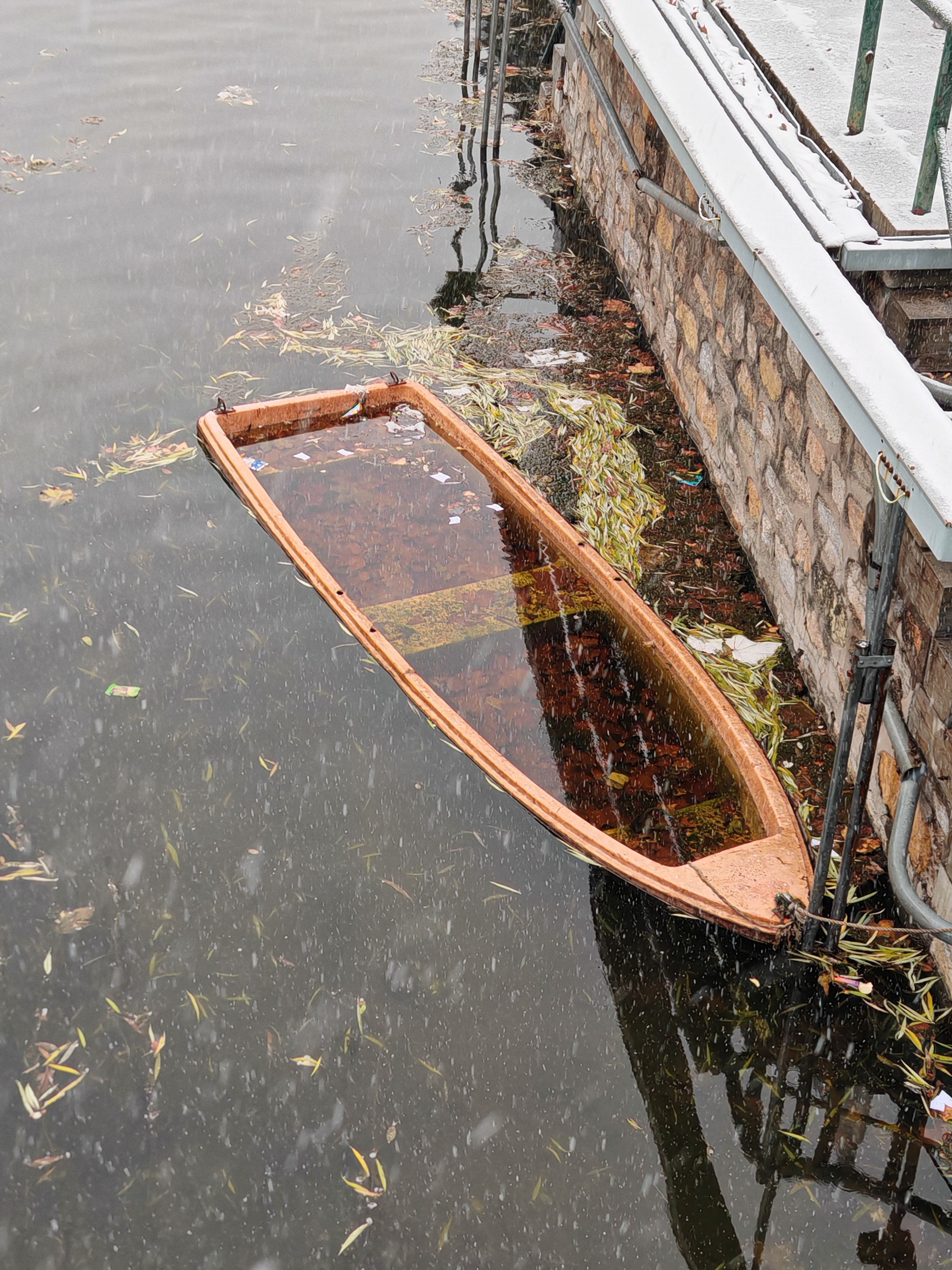 画面中,一艘木质小船侧翻在灰黑色的水面上,船身呈浅棕色,内部灌满了水,还漂浮着枯叶与杂物,船身被绳索系在右侧的石质驳岸旁。驳岸的边缘积着一层薄雪,金属栏杆和管道上也落着雪,细密的雪花还在纷纷扬扬地飘落,水面上漂浮着枯黄的枝叶,整体色调清冷,营造出冬日水畔萧瑟又静谧的氛围。