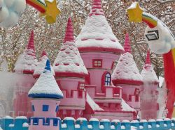 画面中是一座童话风格的粉色城堡造型景观,城堡的尖顶、墙面和装饰边缘都覆盖着厚厚的白雪,红白相映的色彩对比鲜明,其中一个小塔楼还点缀着蓝色的顶边与装饰,增添了童趣。城堡旁有彩虹、星星、云朵的卡通造型装饰,同样落着薄雪。背景是枝干光秃、挂着残雪的树木,细密的雪花似还在飘落,整体场景将梦幻的童话感与冬日雪景的清冷感融合,营造出浪漫又可爱的冬日氛围。