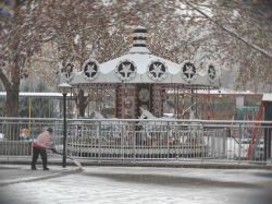 画面里,一座旋转木马被白雪覆盖,白色的顶棚积着厚雪,边缘的星形装饰和红白色的支架在雪景中格外显眼,木马的轮廓也被雪色晕染。旋转木马外围是银色的金属护栏,地面铺满薄雪且有些湿滑。左侧有一位穿着粉红外套的人正拿着工具清扫积雪,身影略显模糊。背景是枝干光秃、挂着残雪的树木,细密的雪花还在飘落,整体画面将游乐园的童趣与冬日雪天的清冷交织,营造出静谧又略带温馨的氛围。