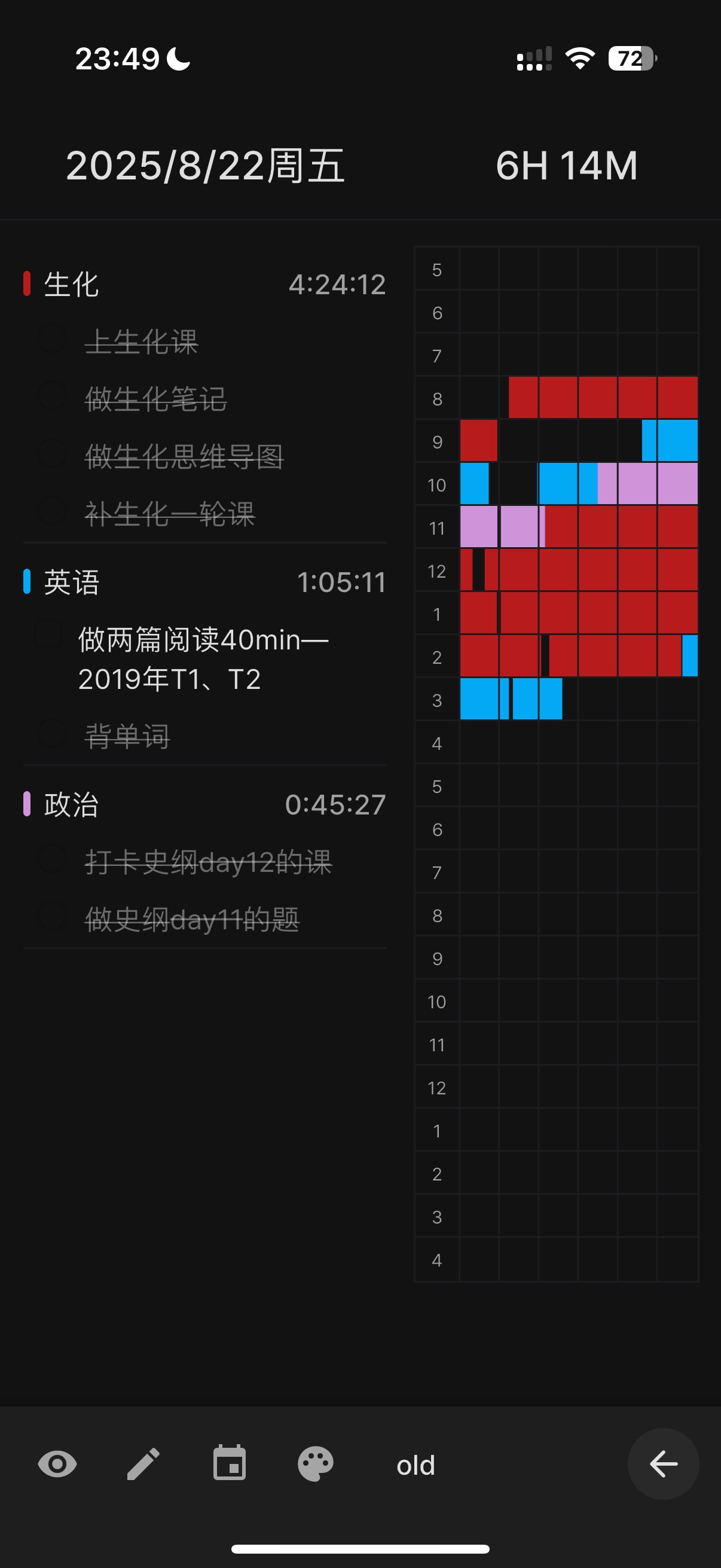 今天是2h,完成了细生上课和背单词,一会洗完澡回来把政治看了就睡。