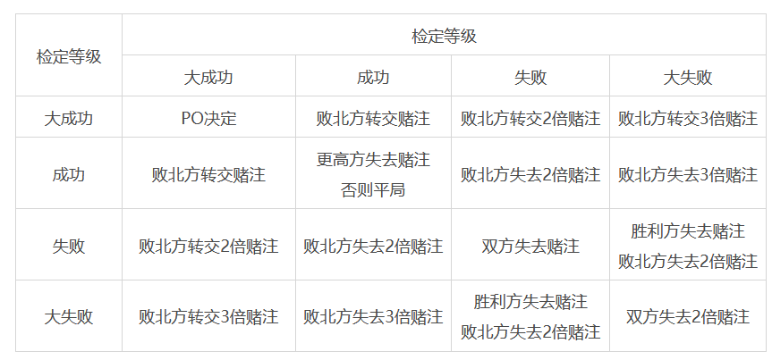 (这儿是“先手有利”的:主动发起检定的一方可以想办法用自己最好的能力,迫使对方用他不那么优秀的能力进行应对)
