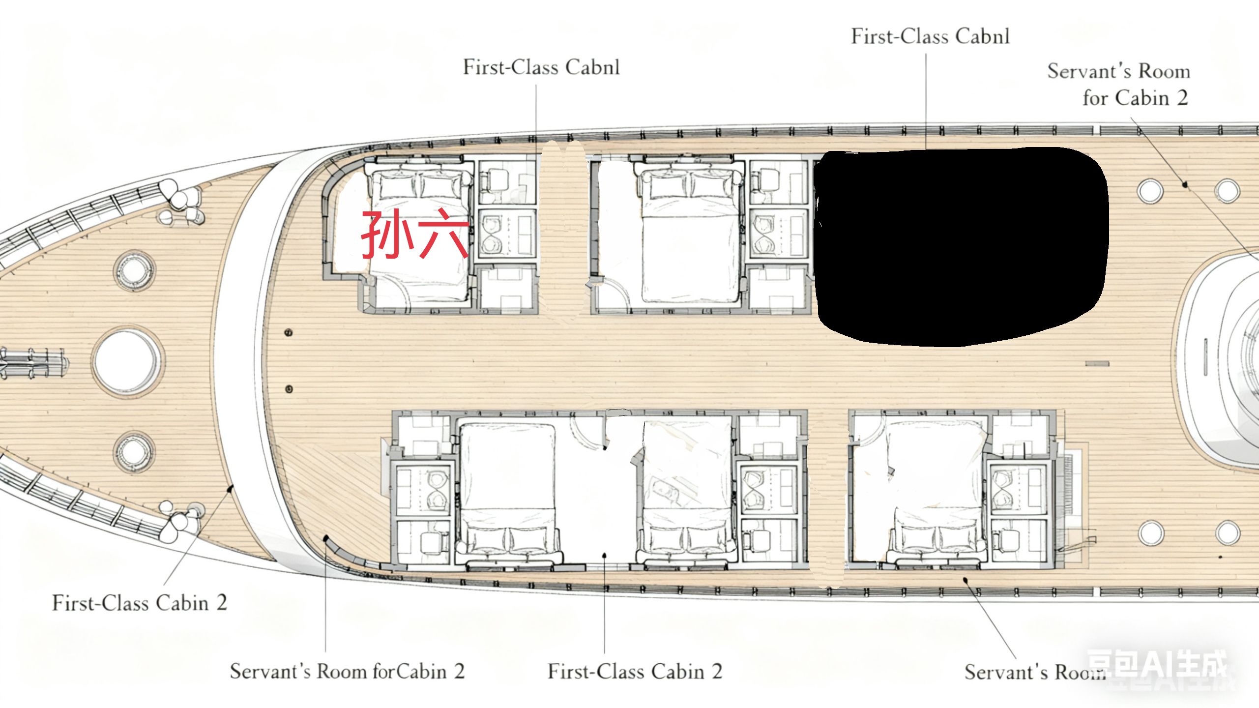 (图为头等舱舱图,孙六房间所在地已标注)