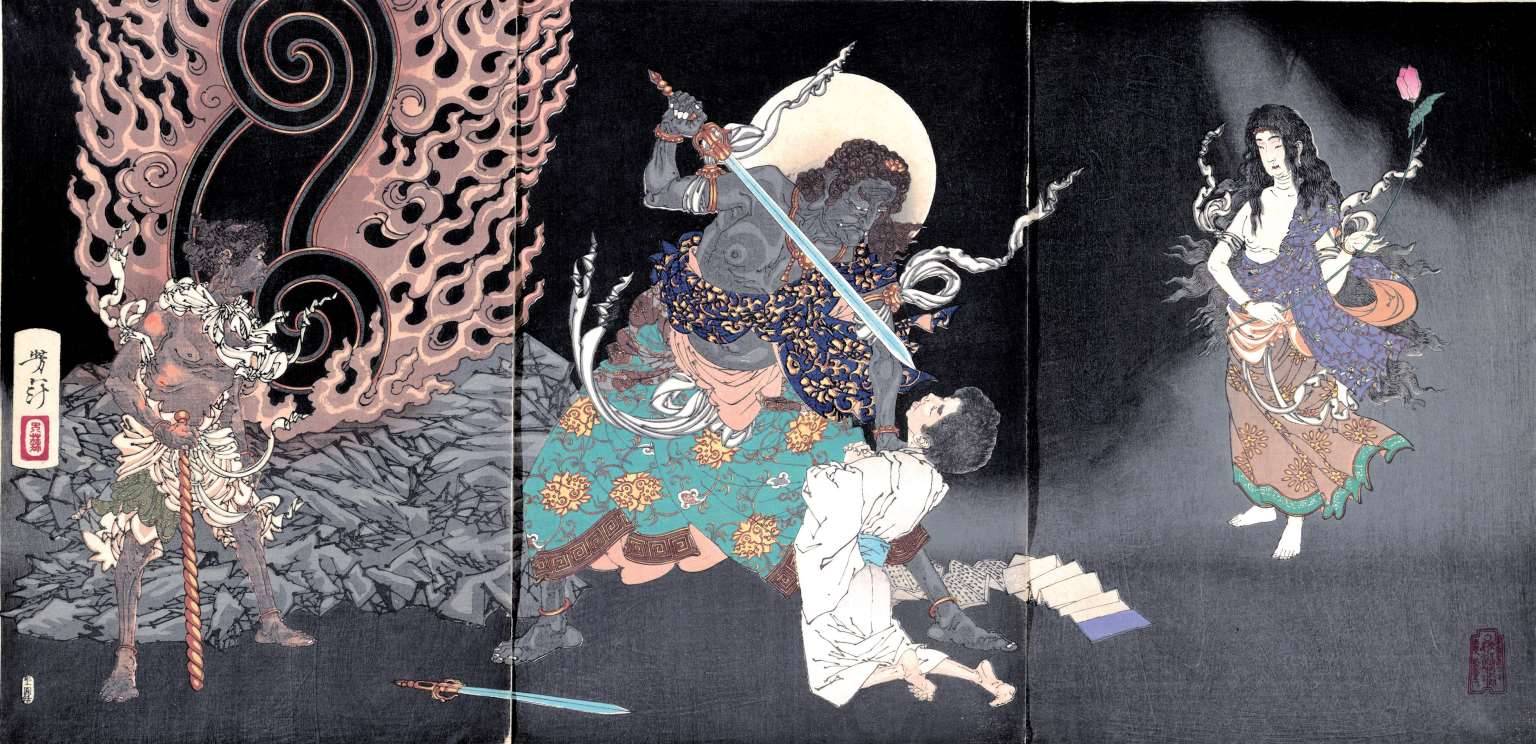 杨扬羊一边嘴上应付着这奇特男子,一边将眼睛往房门里面瞟去,很快便被里面的奇特景象惊得暗暗咂舌,他看见对方房中摆满罗汉,这些罗汉像姿态各异,分别以金、银、铜、铁、锡五种金属制成,每个罗汉高10余厘米,随意数来竟有四五十多座,而房间最中央,挂着一幅大画,上敷以赭墨,间以石青、下绘淡彩,层次分明,所作一通身青黑,发垂披肩,狰狞恐怖,如妖魔般的巨大怪物,身后偏偏有一金光明轮,提着一白衣男子,另一手持着利剑,看上去要将这男子一剑枭首