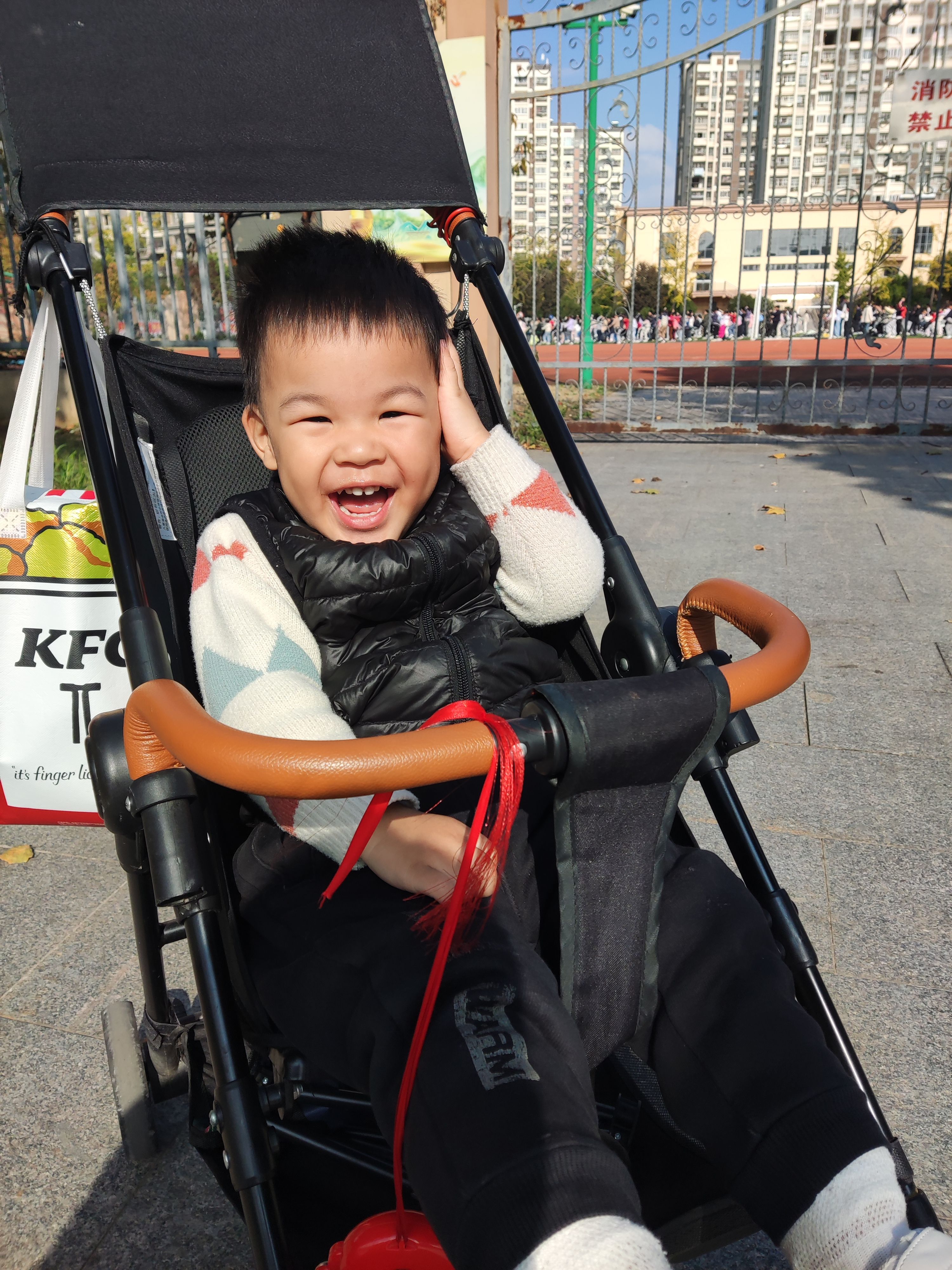 昨天推着小车出去时,前面有一辆电驴开过去鸣了两声笛,娃就冲着电驴笑了两声。偶尔可以被小动静吸引了,是有在变好的对吧・゚( ノд`゚)