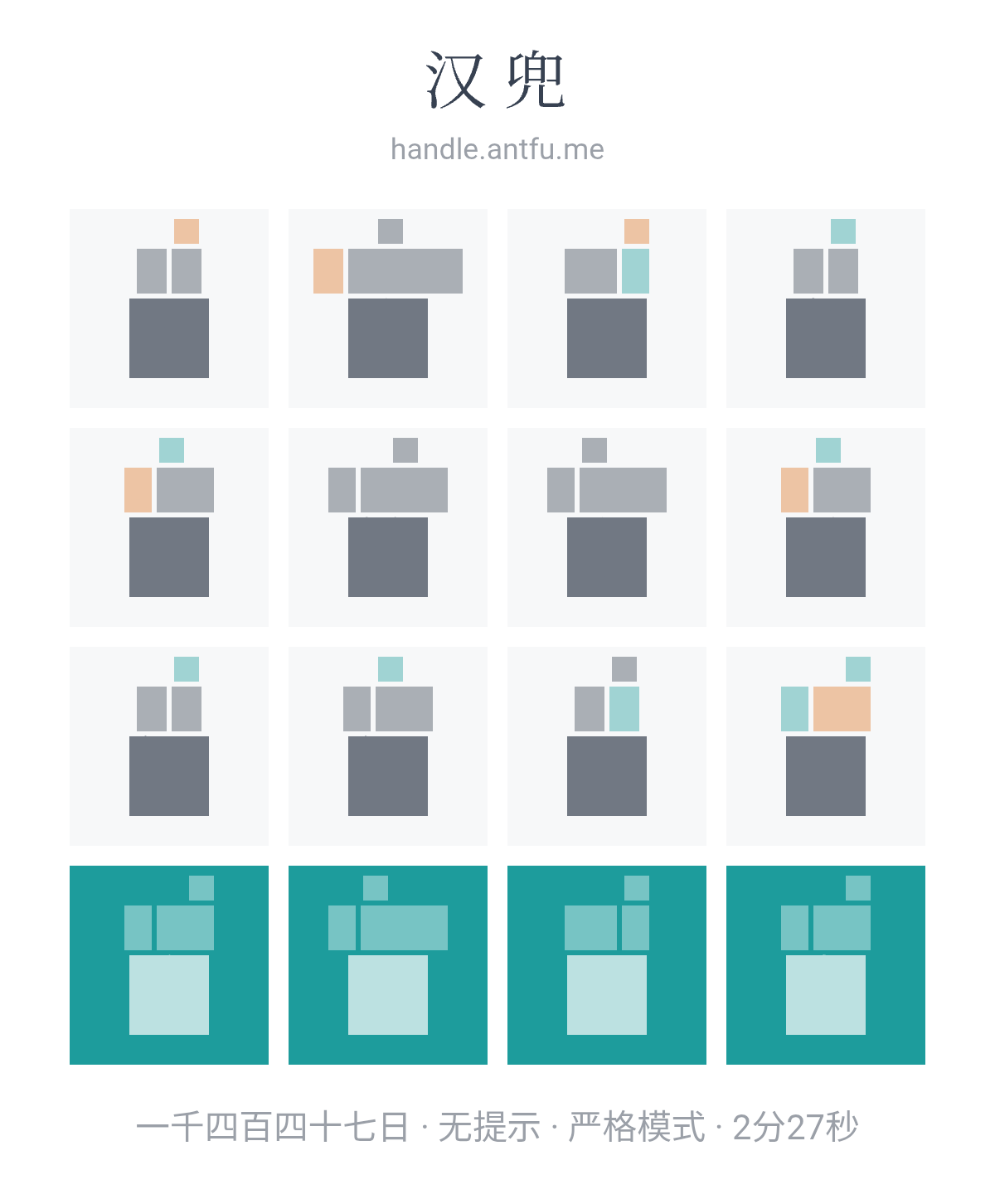 汉兜(https://handle.antfu.me/)是一个通过声母、韵母和声调猜成语的游戏。