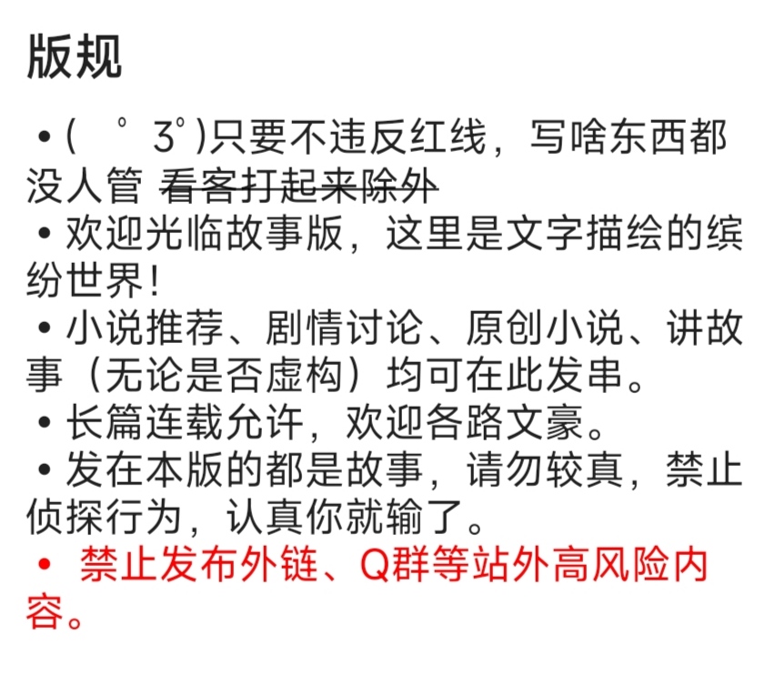 这里还是分享下小说版版规吧,虽然x岛没有严格强调红线是什么,应该还是沿用旧a岛的版规,暂时也没说严格禁止涉黄性暗示这种东西,但是为了你的饼槽,禁止色色!!