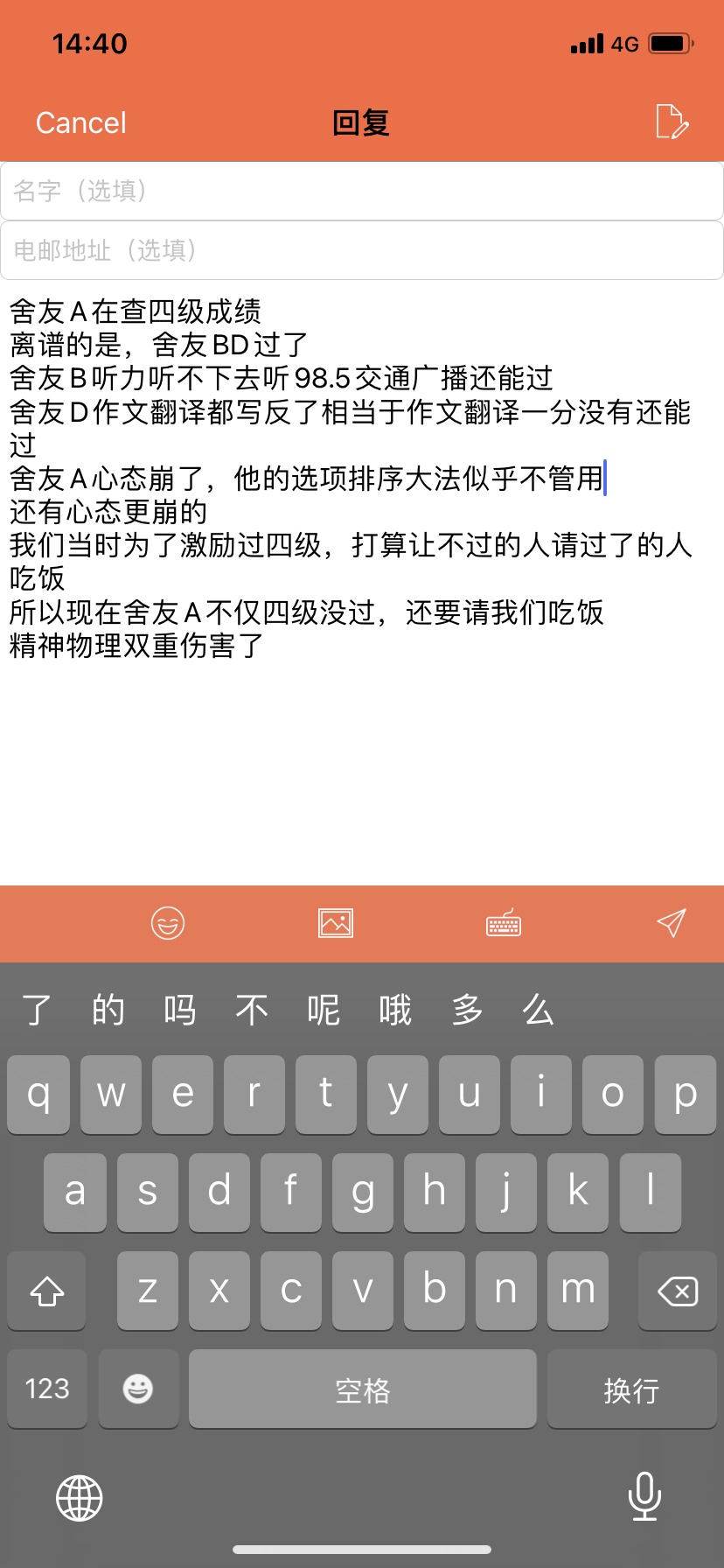 舍友BD想都没想自己四级能过,成绩都没看开始报名时直接就报了,舍友B因为第一次身份证填错了还抢了第二次,现在两个人过了四级却报上了四级的名