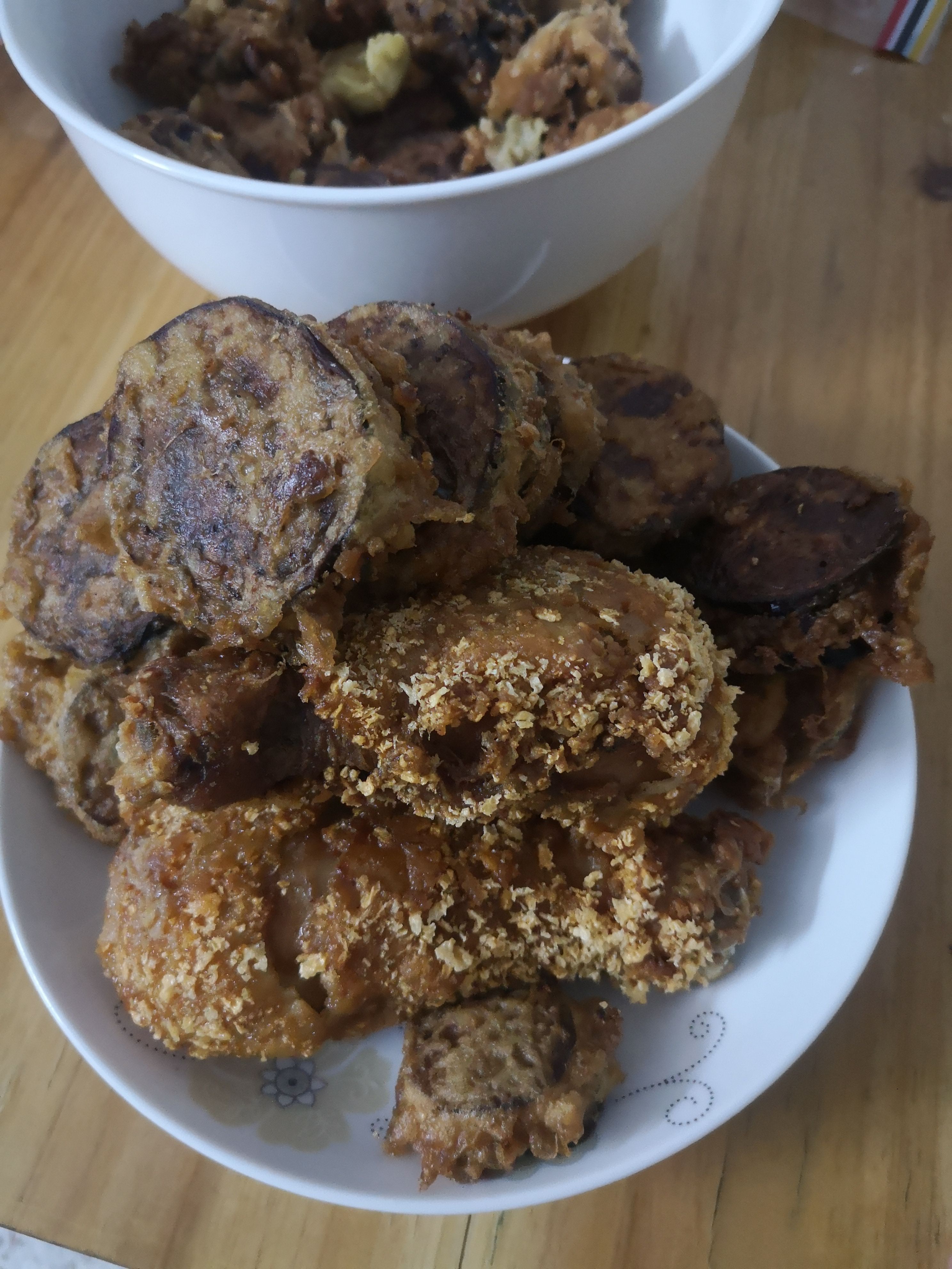 炸鸡腿和炸茄盒。