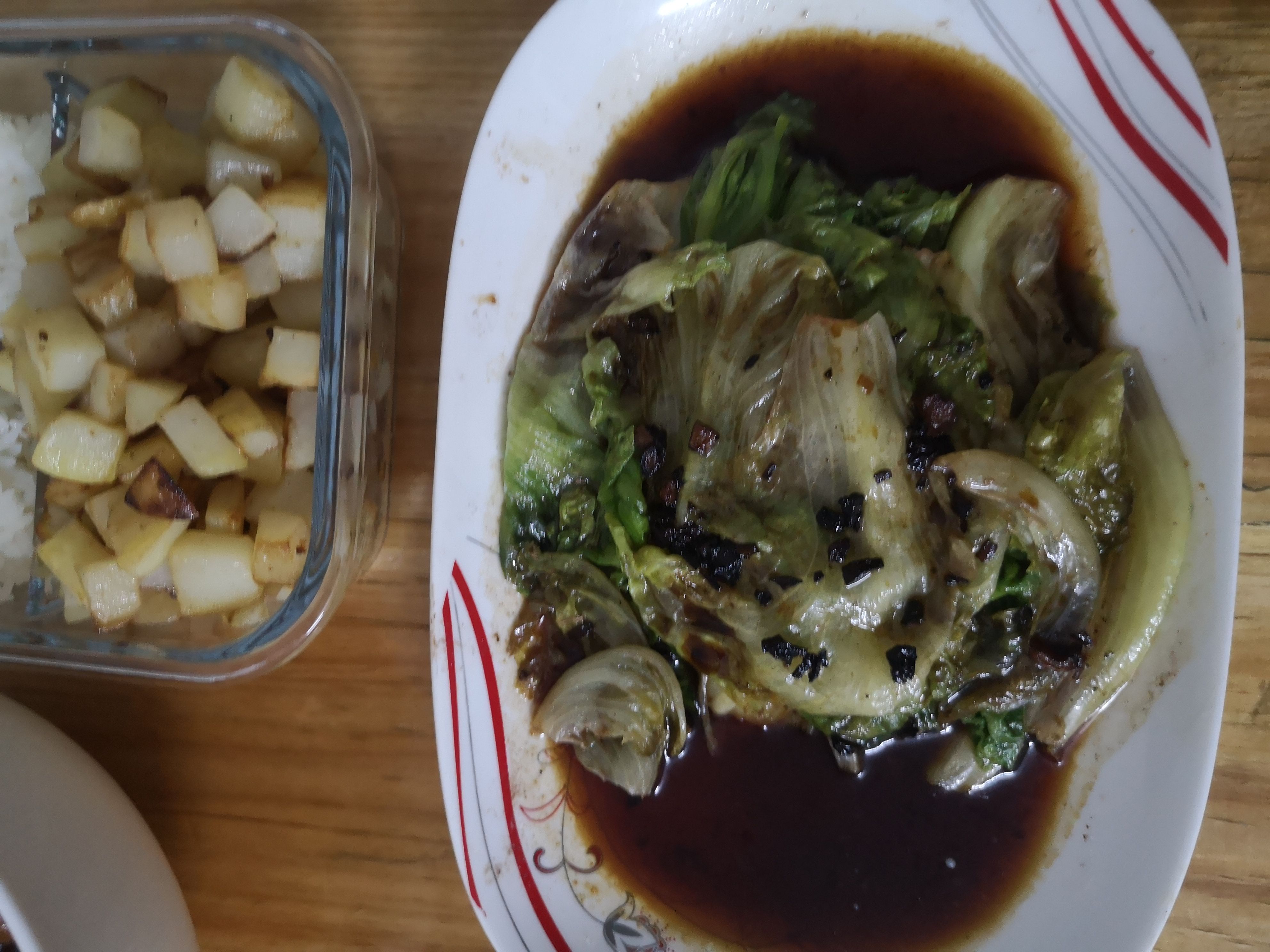 白灼生菜和炒土豆块。