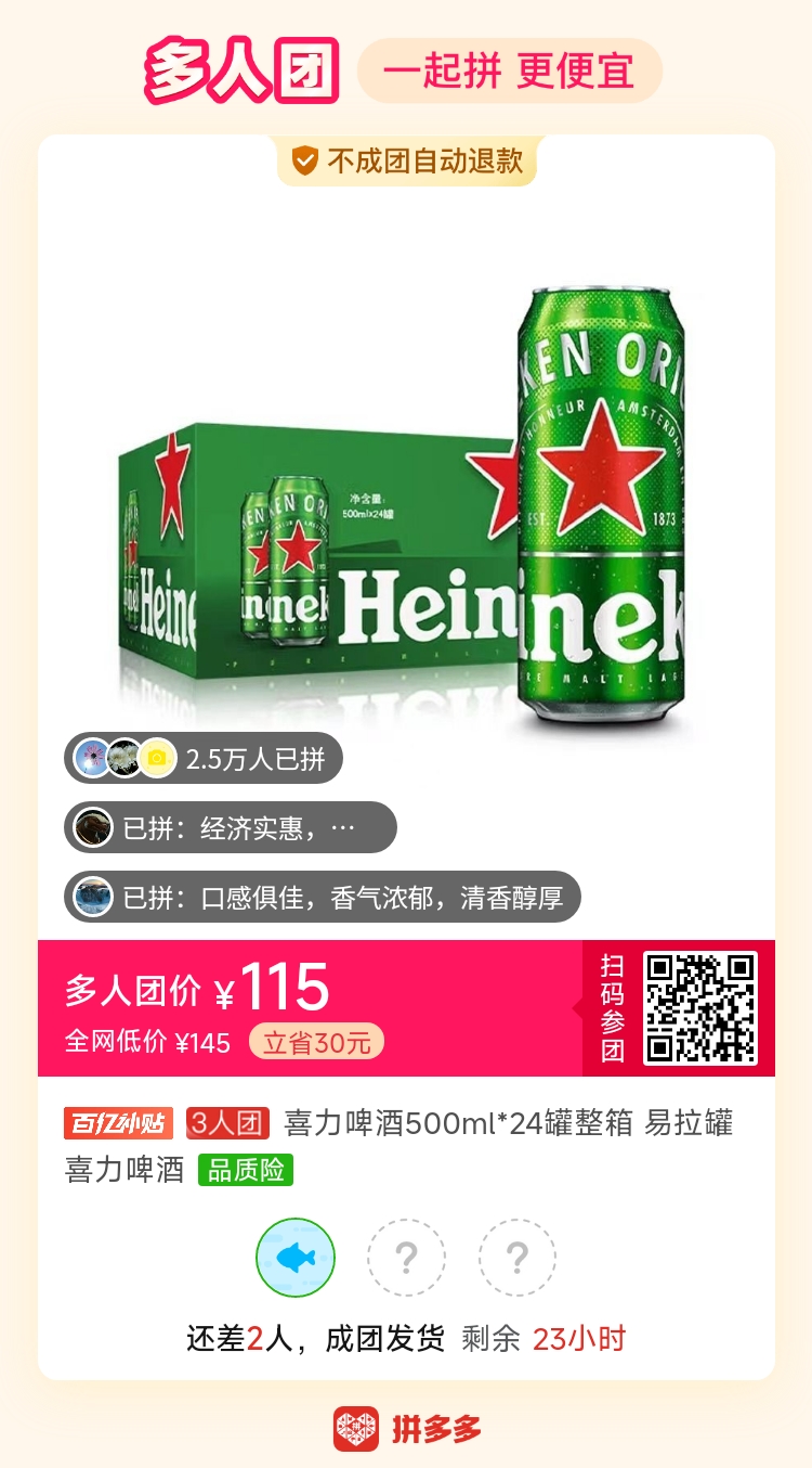 最近想喝喜力有没有人一起买啊,115一箱24瓶500ml