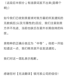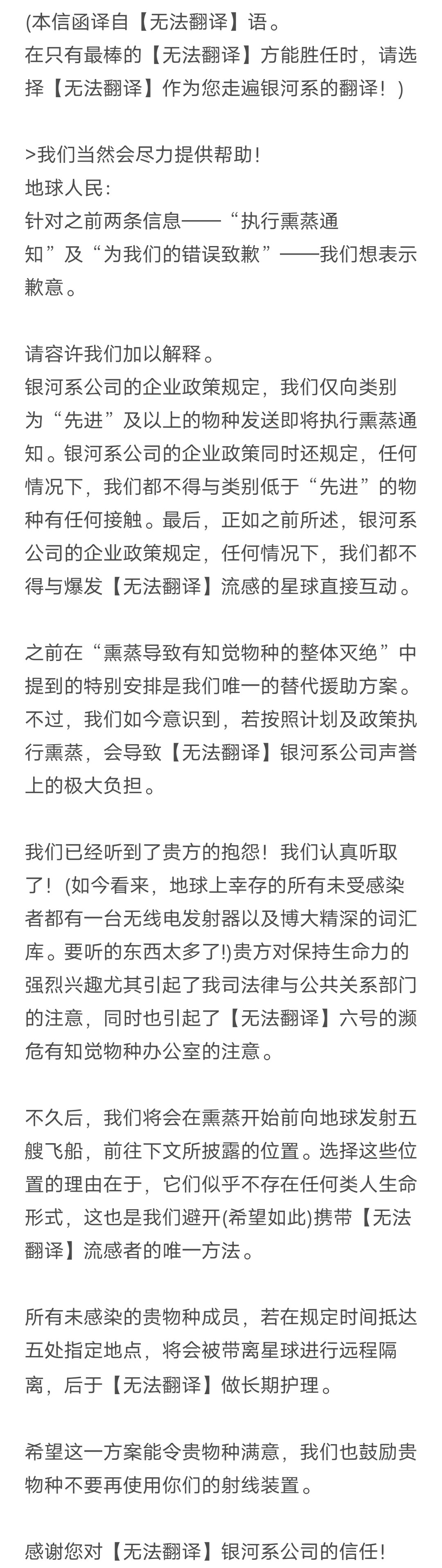 我们本想说“展信佳”,然而事实上不太可能。非常抱歉事情变成这样。我们试图说服外星人再派船下来,不过应该是失败了。它们的翻译软件不怎么靠谱,它们也不是很确定到底该跟哪个物种交流。我是说,它们同意让我们带狗上船(狗狗赢了!),然而一开始的三个小时里它们一直试图跟狗而非我们说话。还有一个很大的问题,它们竟然不知道我们需要呼吸氧气。