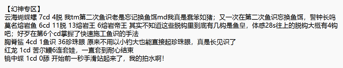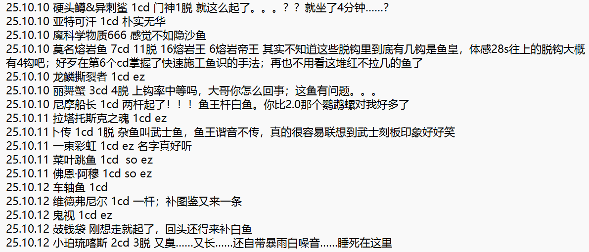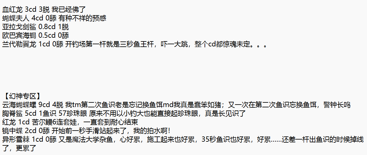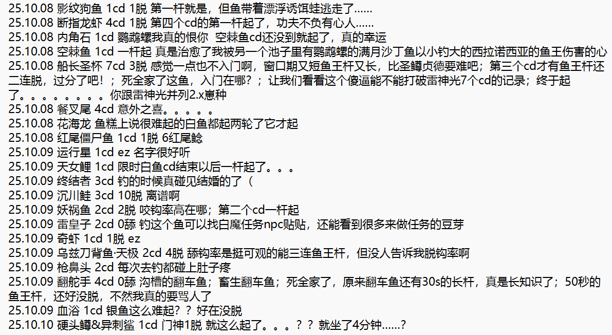 我觉得不一定准,比如我记得莫名熔岩鱼好像去了8个cd,但记录里只有7个,到底怎样我也记不得了,看了一下石之家钓鱼记录,也没给这种详细数据,就随便一看吧