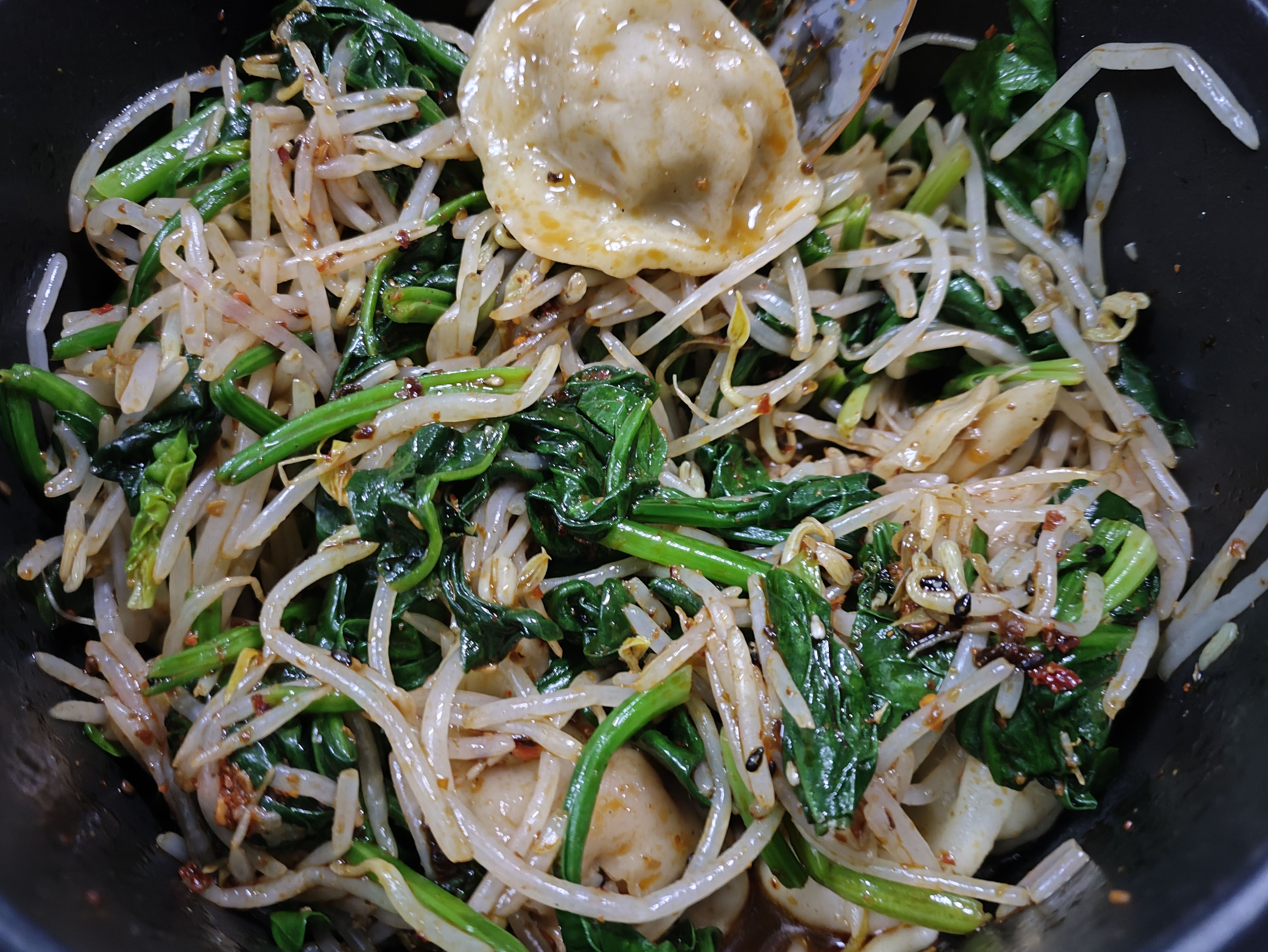 凉拌菠菜绿豆芽饺子,感觉辣子放少了