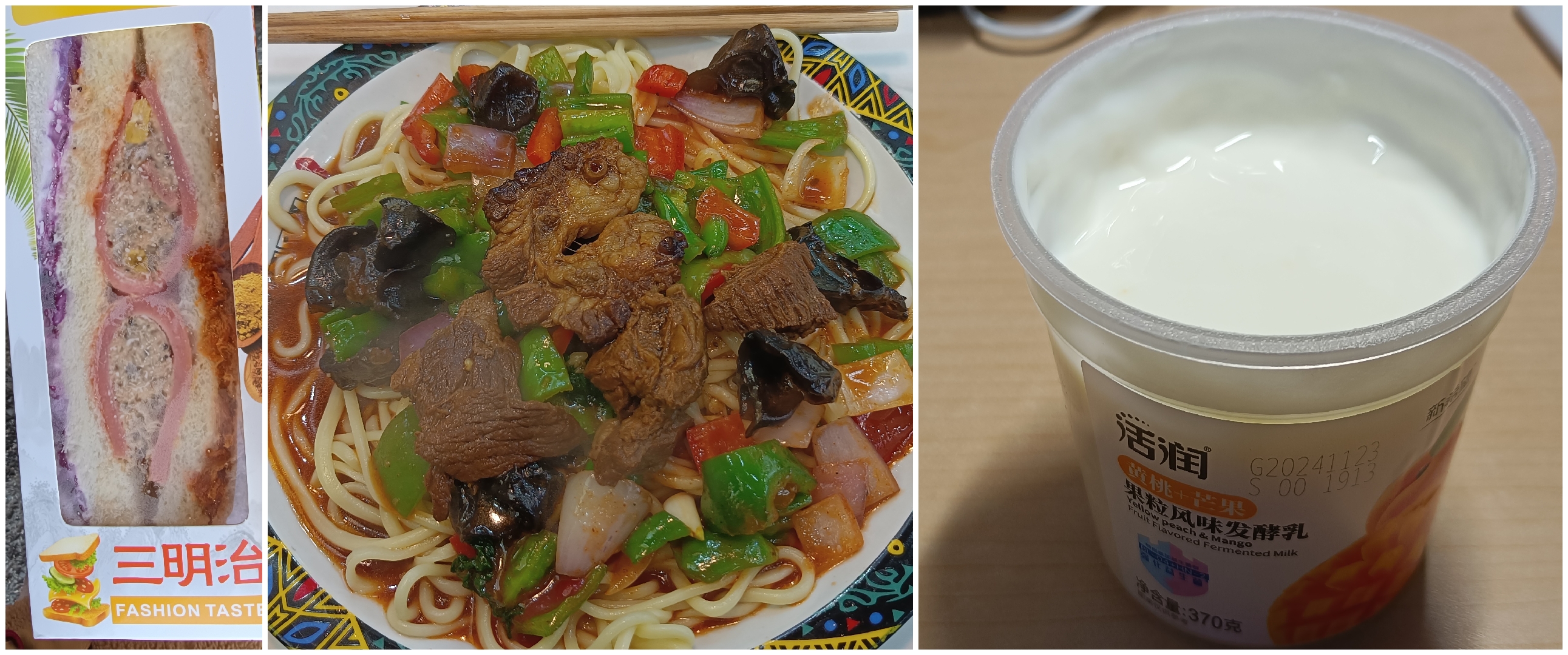 晚餐:活润果粒风味发酵乳(黄桃芒果)(370g),曼可顿营养强化全麦面包九片