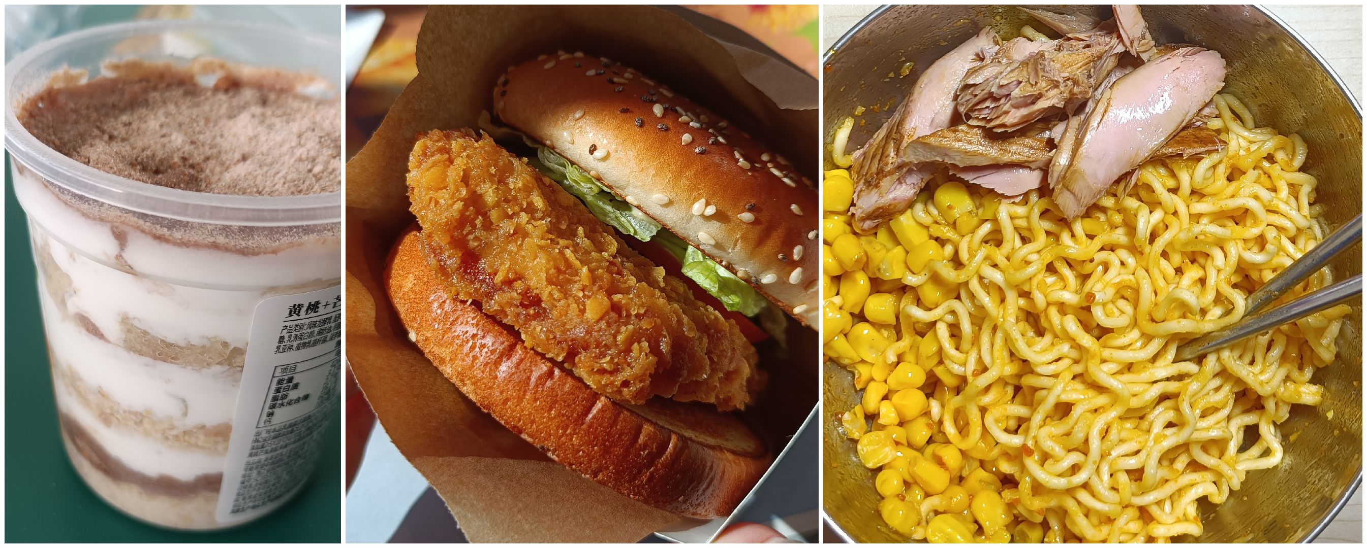 晚餐:金枪鱼罐头一个,玉米粒一小袋,天然麦场咸蛋黄拌面一袋