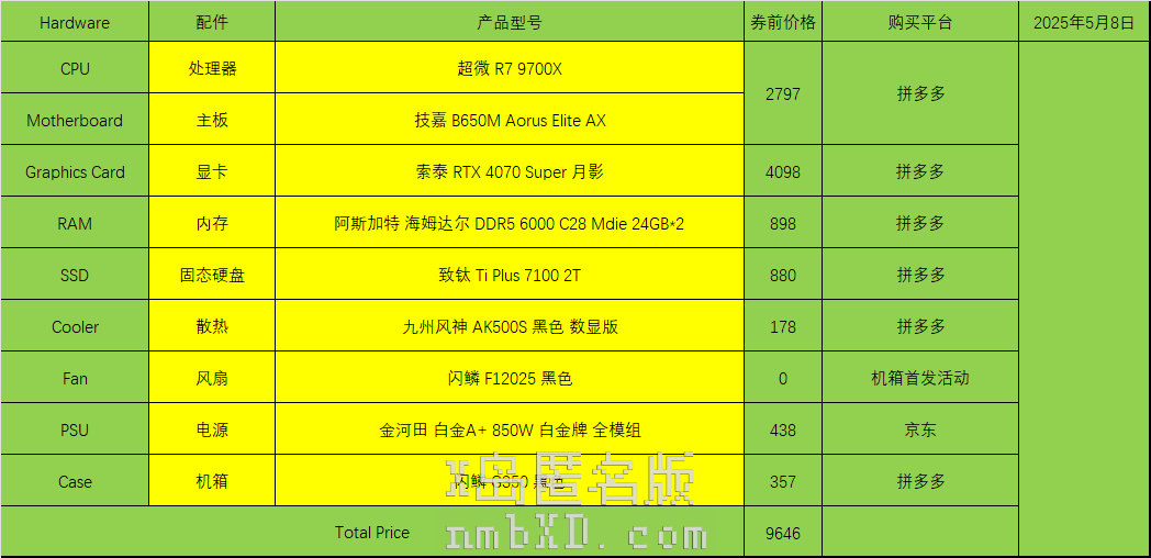 还真做过类似的,我找一下,因为是今年五月做的小机箱配置,目前来说价格会偏高。我给一个当时配置、一个现在按9600x和普通机箱配置的配置单