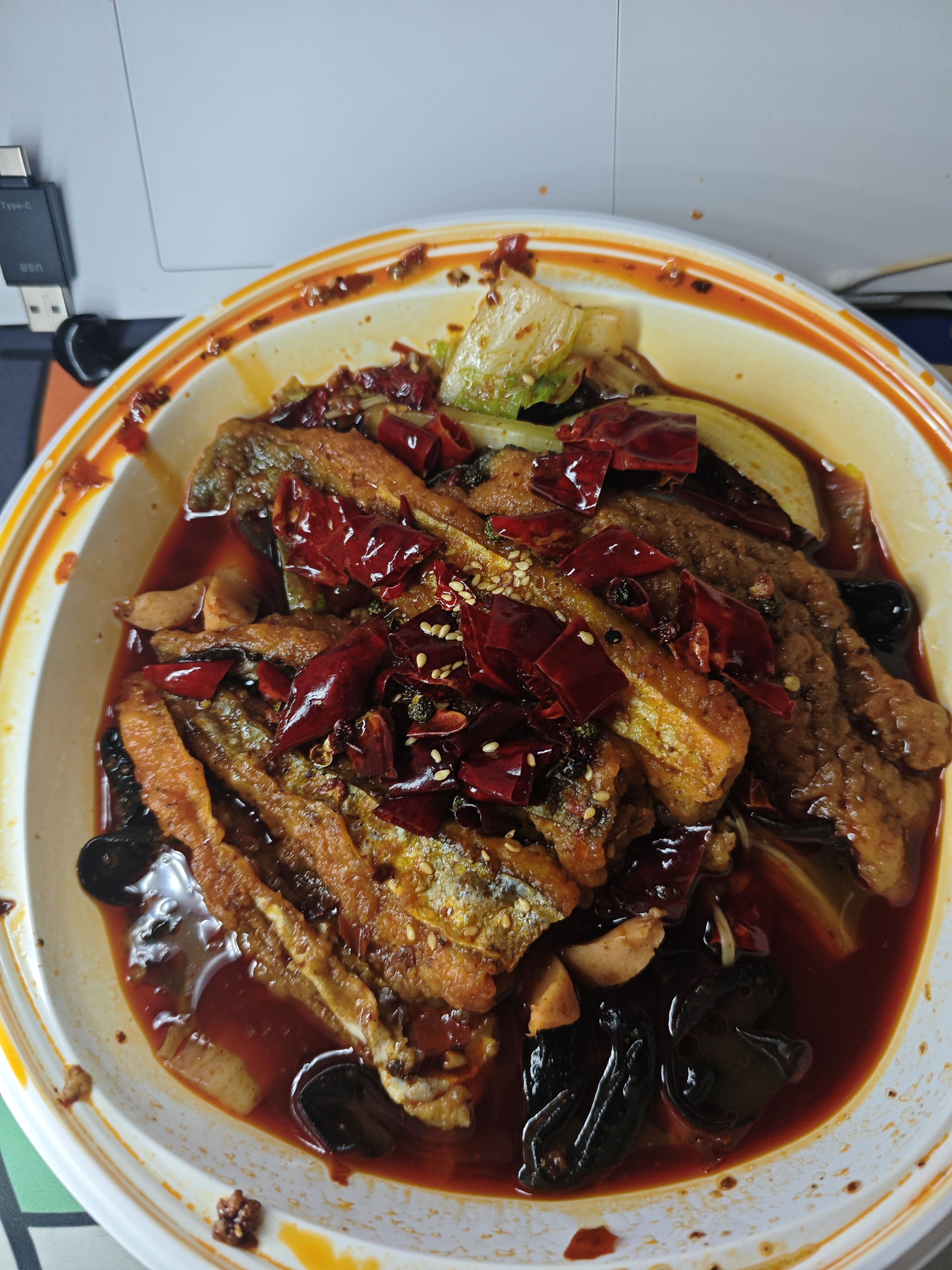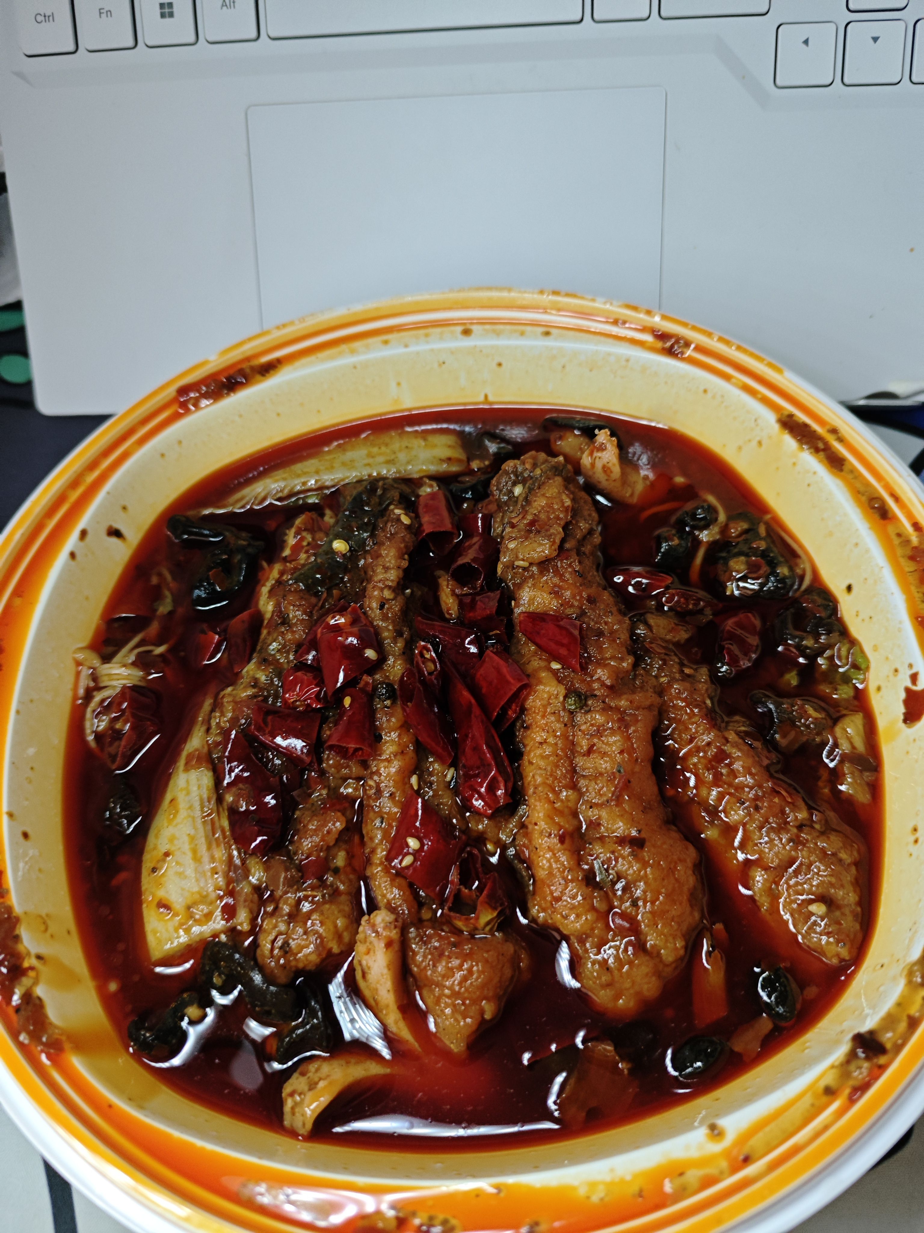 今天中午……还是麻辣鱼柳ᕕ( ᐛ )ᕗ昨天因为瞎忙活,鱼已经凉掉了!所以今天特意蹲在外卖柜拿回来,肥哥们记得按时吃饭