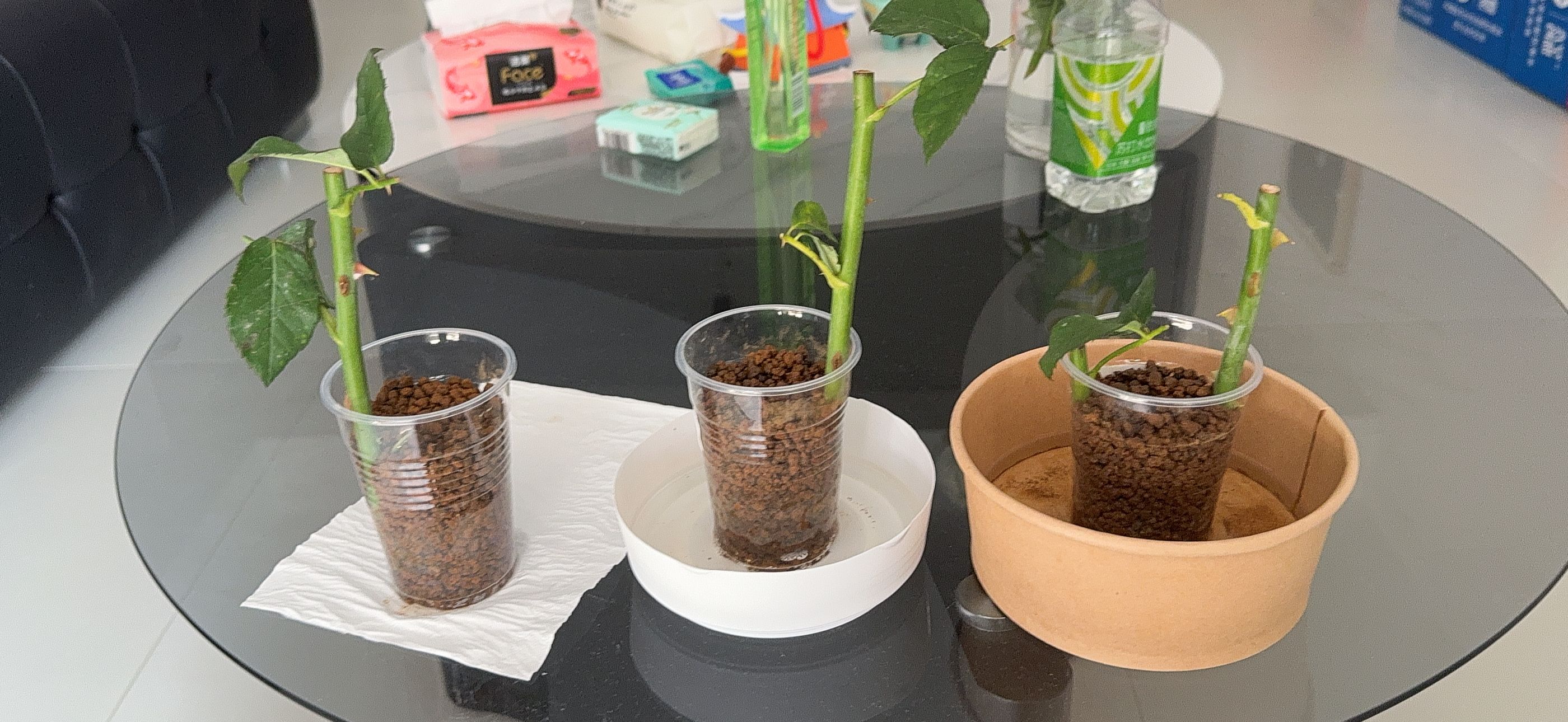 这三杯是放在家里的,两杯有托盘浸水一杯没有托盘。有托盘的两杯一杯是多菌灵直接扦插,一杯是过水扦插的,没有托盘的那支是多菌灵直接扦插的。po本来应该再放一杯过水扦插无托盘的在这里,但po的土用完了,暂时先分这几组。