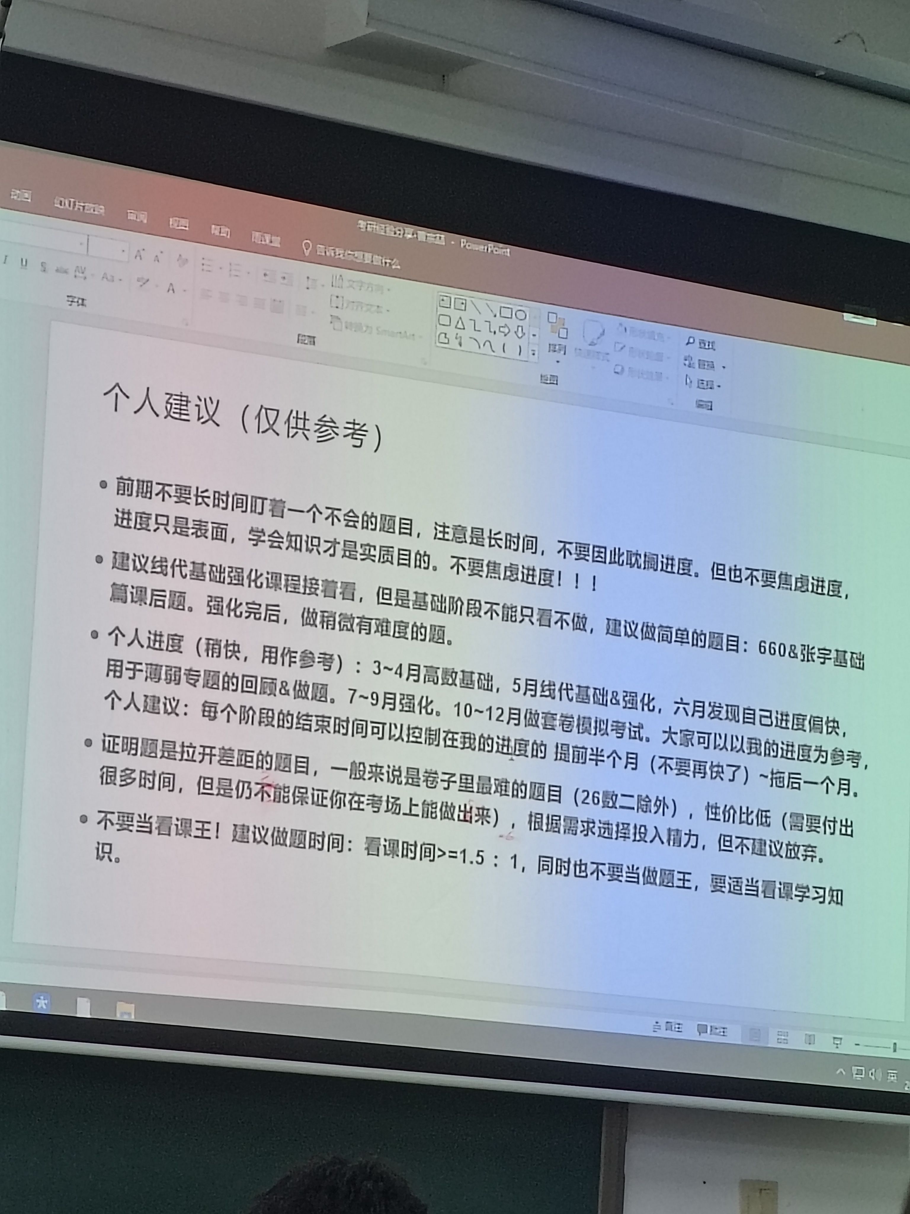 今天之前考研上岸的学长回来宣讲经验,稍微去听了一会,花了四五十分钟吧。有个学长数二150也太恐怖了,他说进度再快也不要比他快半个月以上,准备五月份线代学完之后像他一样搞复盘和学习