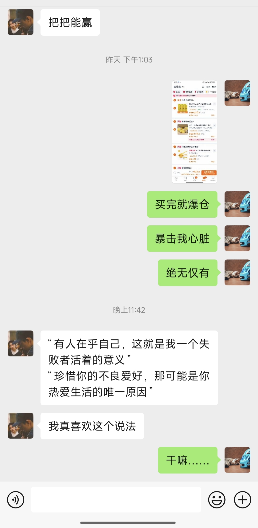 晚上五排车我们五个人打输一波团战,这小子还活着,我们都在讨论复活之后干什么,他突然来了一句:“( `_っ´)今天是你的生日,我一定会带你打赢这把的”