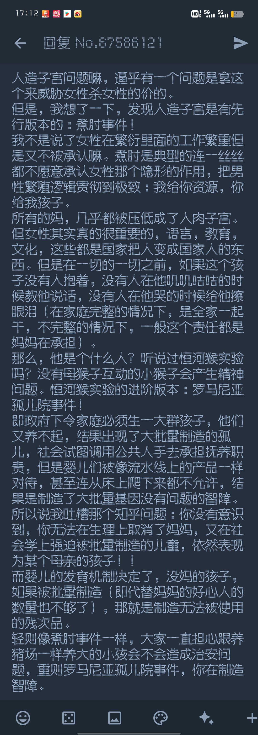 但在正常生育逻辑下,母亲再累也是爱孩子的,你要是把生育完全托付给社会,制造出来的到底是什么孩子,真不好说。