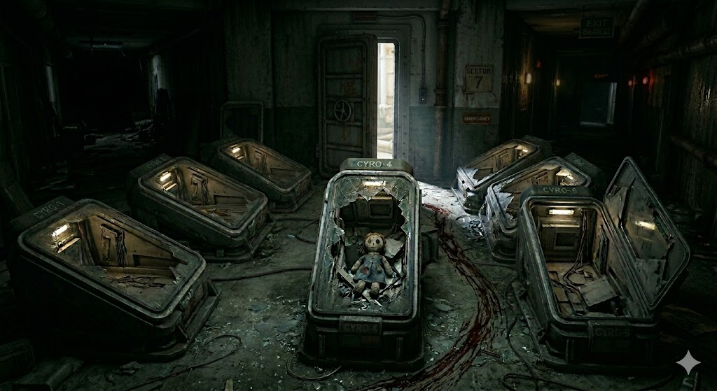 你面前还有剩下七个整齐排列的低温休眠仓,其中五个已经被打开,里面的人不知踪影,另外一个被暴力的拆开,钢化玻璃和金属板被某种粗暴的外力撕裂,留下如同牙印一般的金属断口,里面瘫软着一具支离破碎、被咬下头颅的尸骸