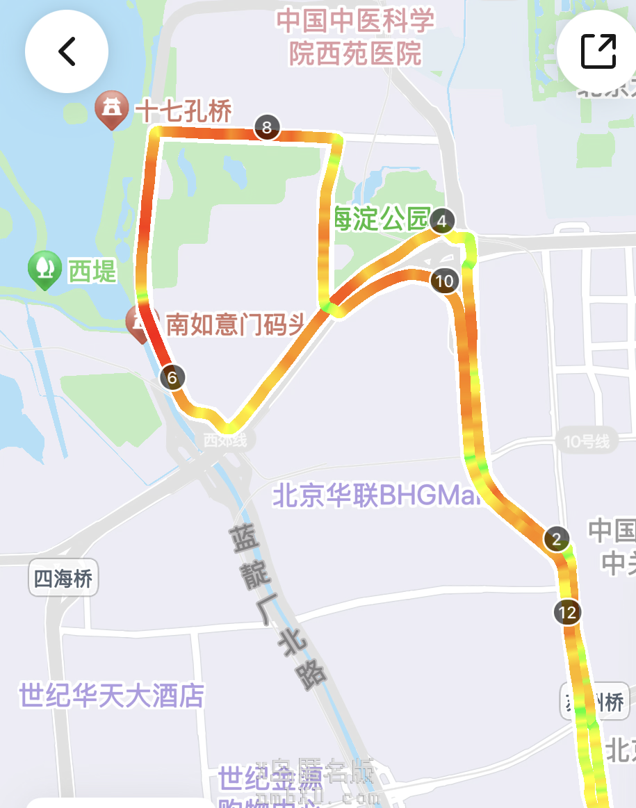 好好笑(;´ヮ`)原来海淀公园绕圈是在公园外面绕圈阿…我跟着导航骑,骑着骑着猛然发现怎么又回学校了,仔细一看原来是绕了一圈回来了・゚( ノヮ´ )