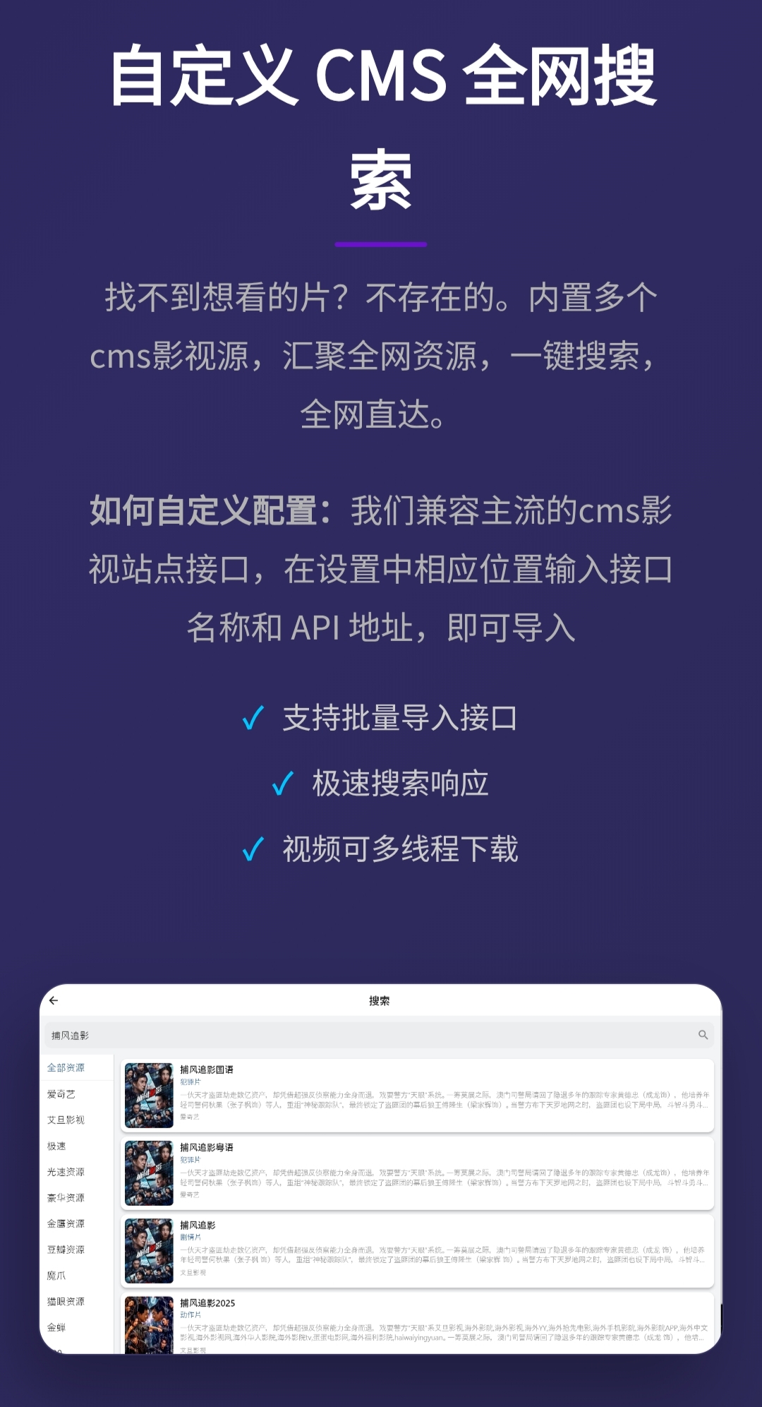 1.内置众多视频源可以导入视频源