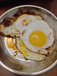 ③炒锅加油,小火炒香肠、培根等含油的肉类,熟后捞出。倒入鸡蛋液,翻炒至虎皮色,捞出。关火下米饭,用铲子压或切米饭,将米粒打散。开火,下前面处理过的熟的食材,翻炒均匀。出锅前加盐,关火后加葱花