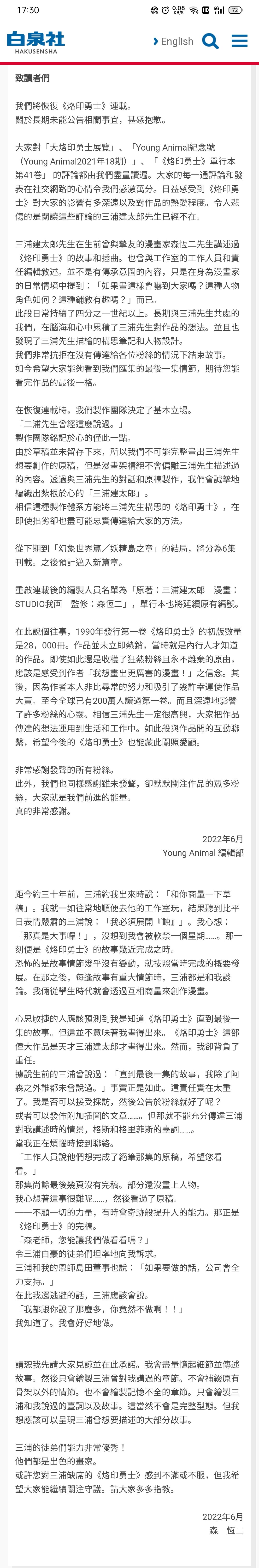 白泉社的公告链接:https://www.hakusensha.co.jp/information/63802/