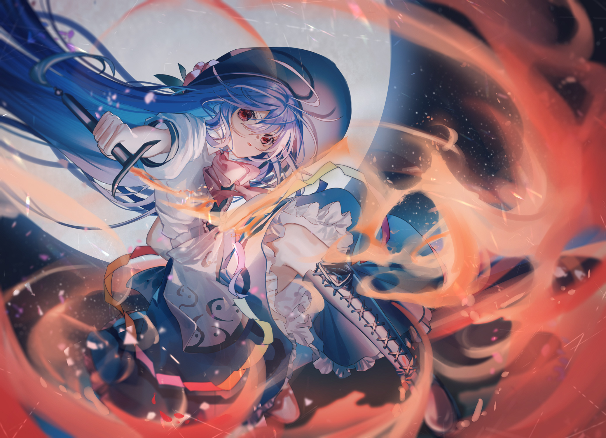 找个女朋友一起过劳动节,要求不高,有着一头蓝色及腰长发,末端稍卷,头戴一顶黑色礼帽,帽子上装饰有可以吃的桃子和桃树叶曈,帽子上有桃子装饰,袖口的花纹形似金箍,身穿白色短袖连衣裙,袖口有着金箍花纹,门襟为黑色,两侧有白色褶边,裙摆分为两层,上层为白色围裙,有黑色藤蔓状花纹,边缘缀着彩虹色带子,下层为蓝色,有着天空的图案,边缘为白色荷叶边,领子上戴着红色蝴蝶结,腰后系着浅蓝色大蝴蝶结,脚穿深棕色长筒靴,手持绯想之剑。