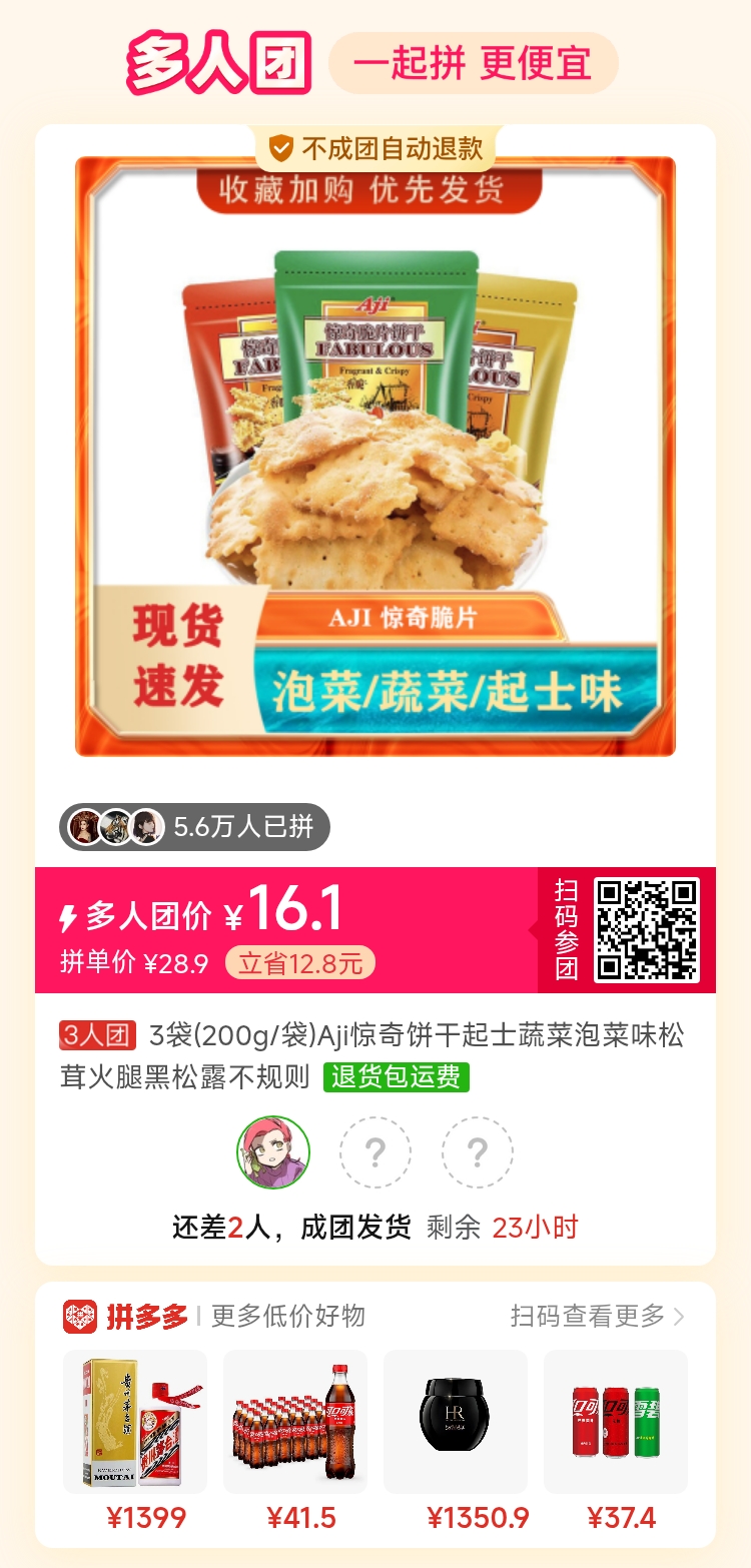 2:/⇥Orfqyb2f0siFT⇤ 复制并打开拼多多APP,16.1元拼团购买3袋(200g/袋)Aji惊奇饼干起士蔬...,仅剩2个名额